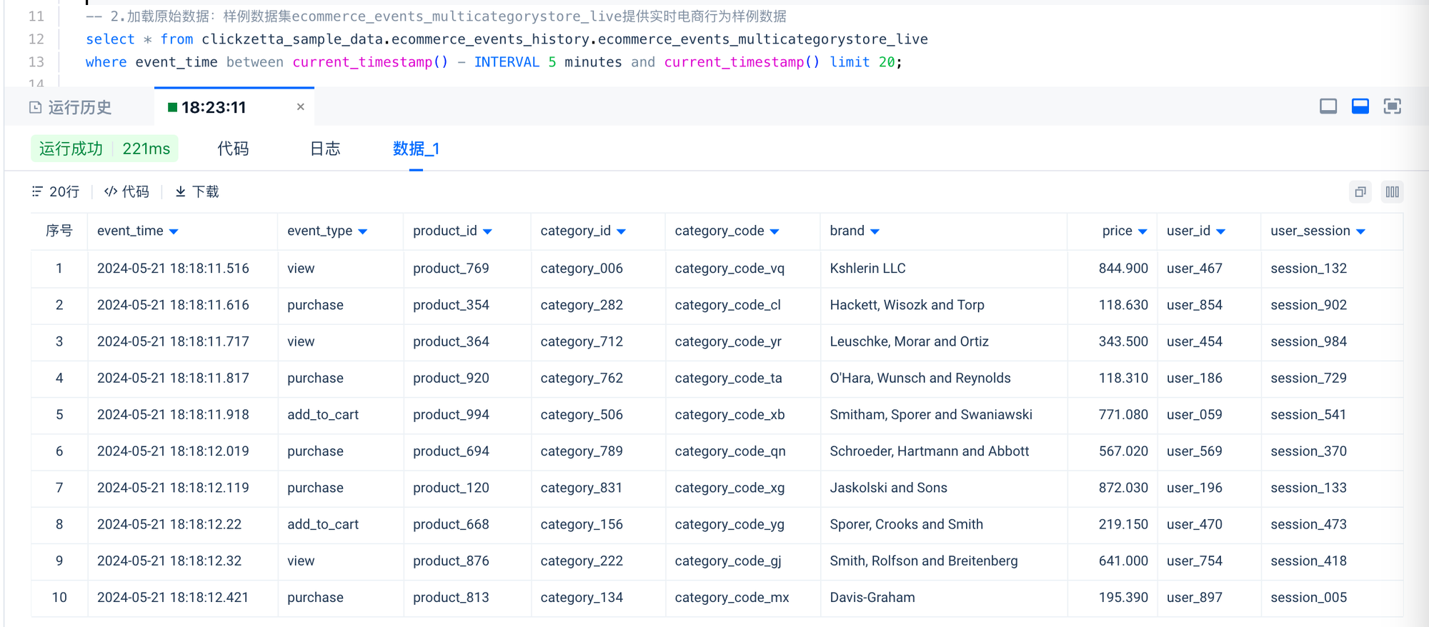-- 2. View raw data: The sample dataset ecommerce_events_multicategorystore_live provides real-time e-commerce behavior sample data