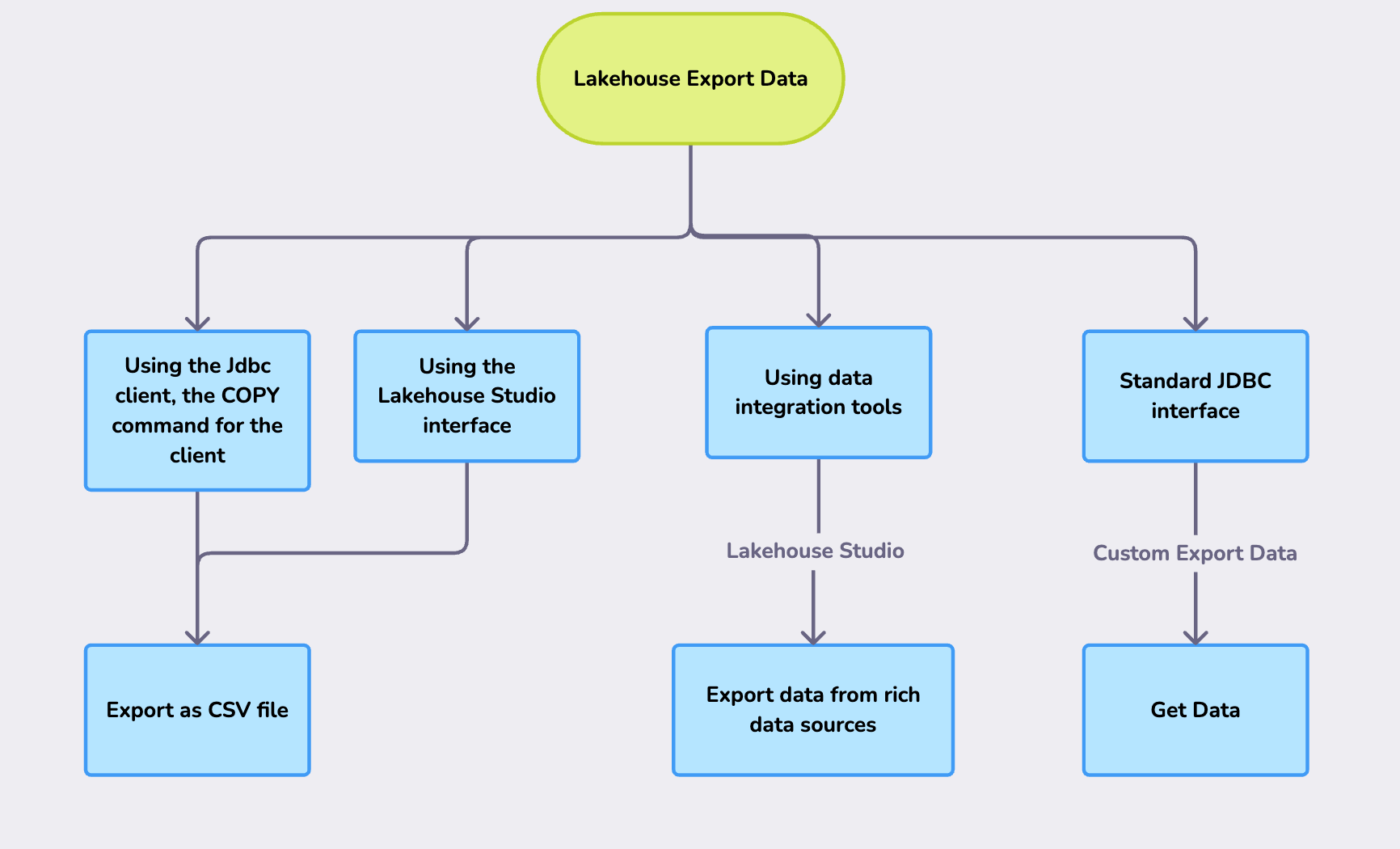 The Lakehouse big data computing engine provides flexible data export functionality, allowing users to export data in CSV file format for use locally or on other data analysis platforms. It also supports the use of data integration tools, which support a variety of data sources such as MySQL, PostgreSQL, HIVE, TIDB, StarRocks.