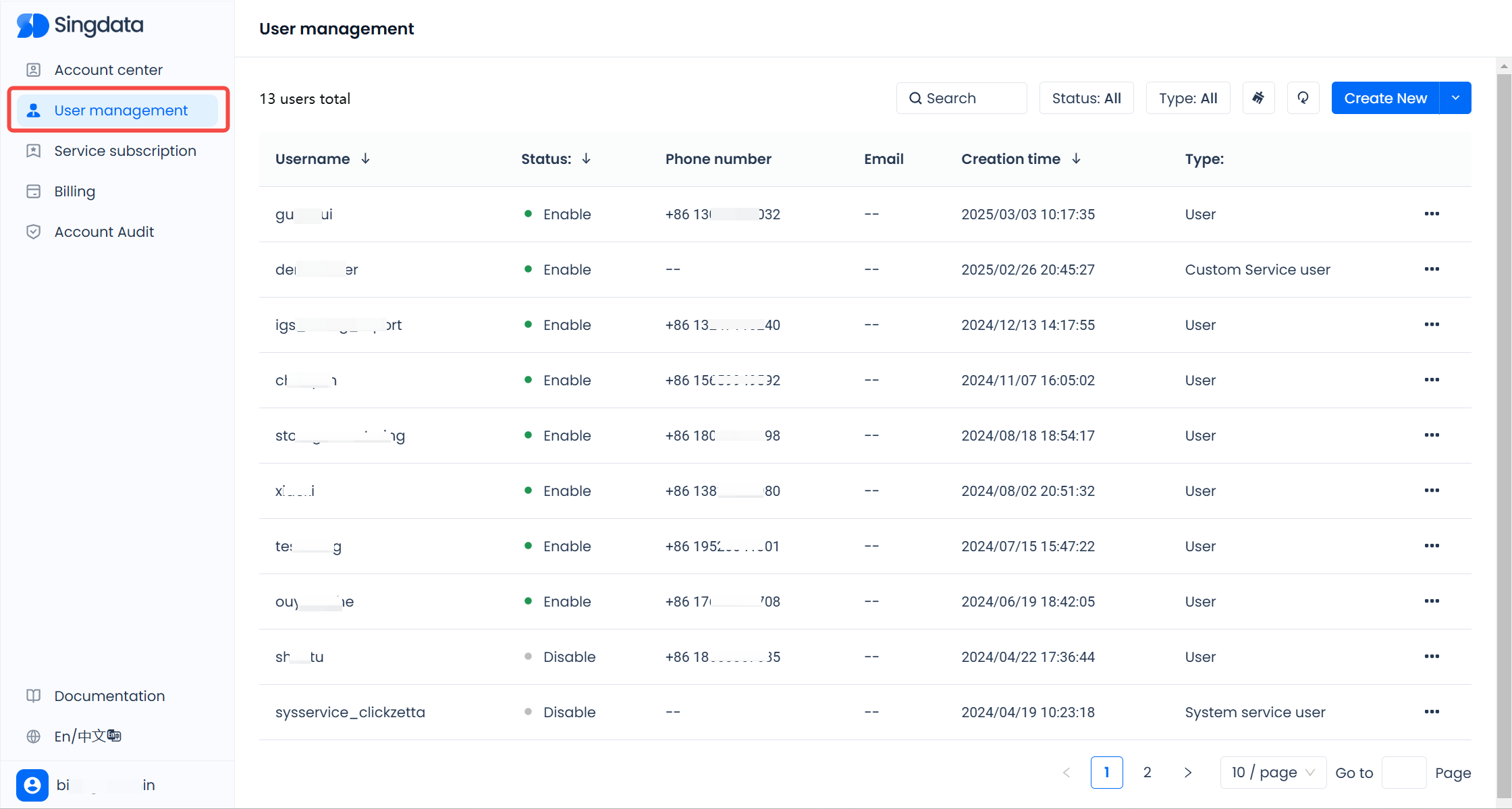 Service instance users are users within the scope of a specific service instance (instance). Users can only be granted various roles and permissions within the service instance. Global users are automatically synchronized to each service instance, becoming service instance users. Therefore, the creation, deletion, and management of the enabled status of service instance users are all conducted on the global "User Management" page. The "User" list within the service instance only provides user information query functions.