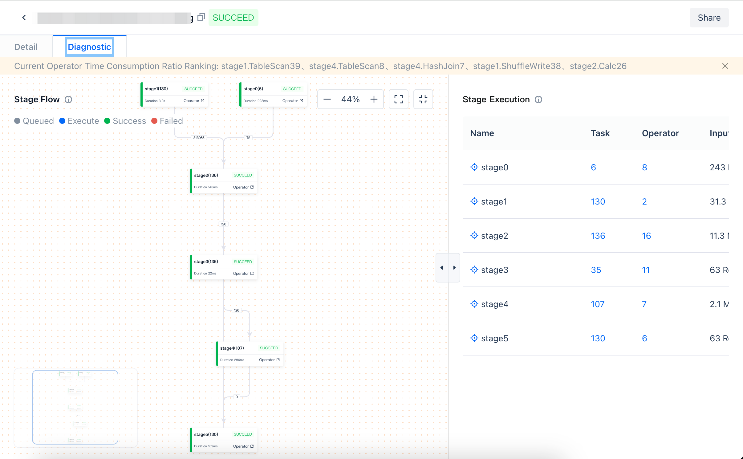 - running: SQL data processing time, you can click on diagnostics to view the time taken by each operator