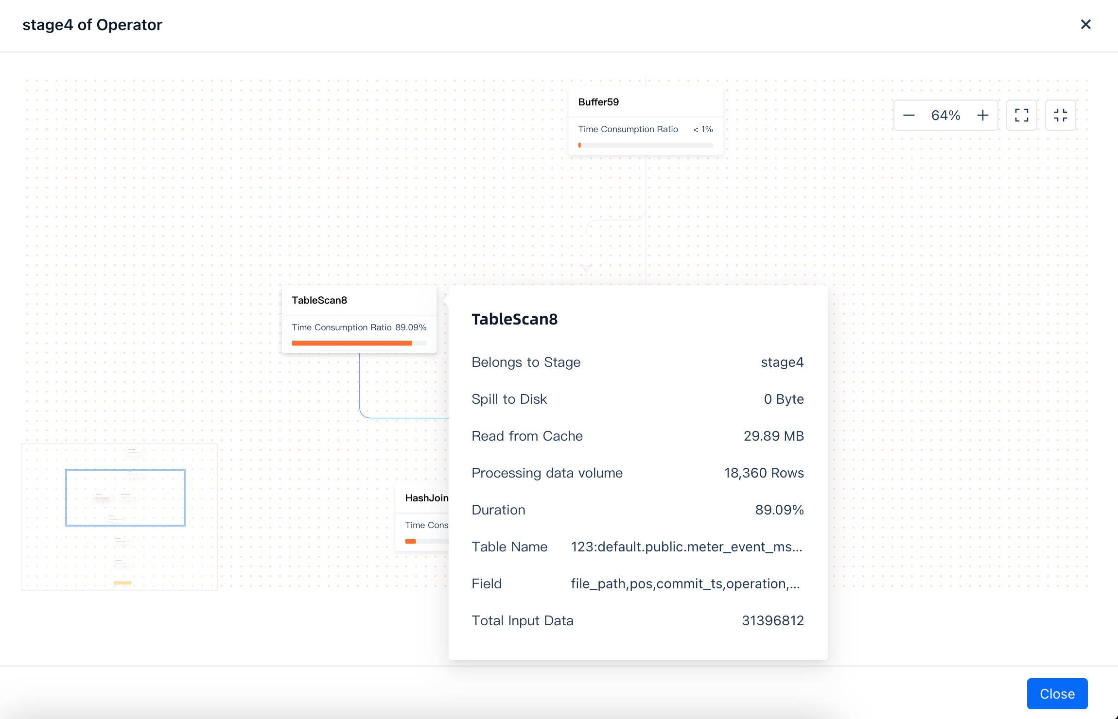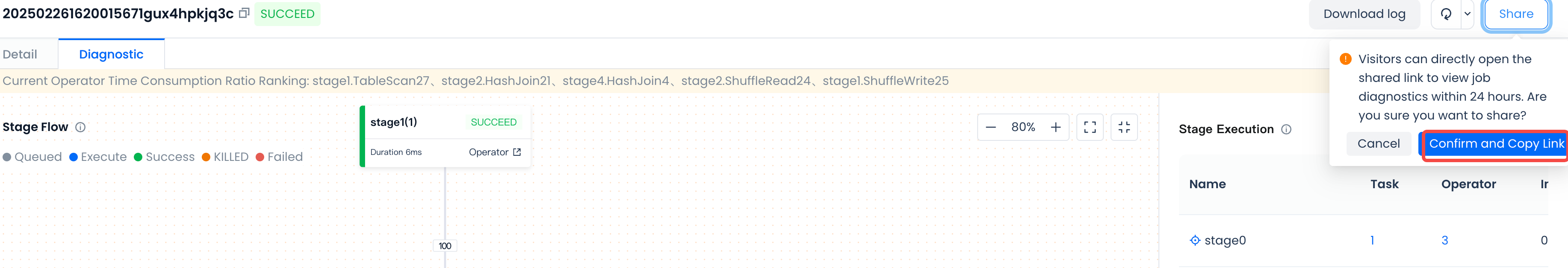 During the execution phase, you can click on the executing operator to query specific steps and strategies. For example, moving the mouse over a specific operator can correspond to the specific operator executed in the SQL. This helps you identify which specific operator is causing the job to run slowly.