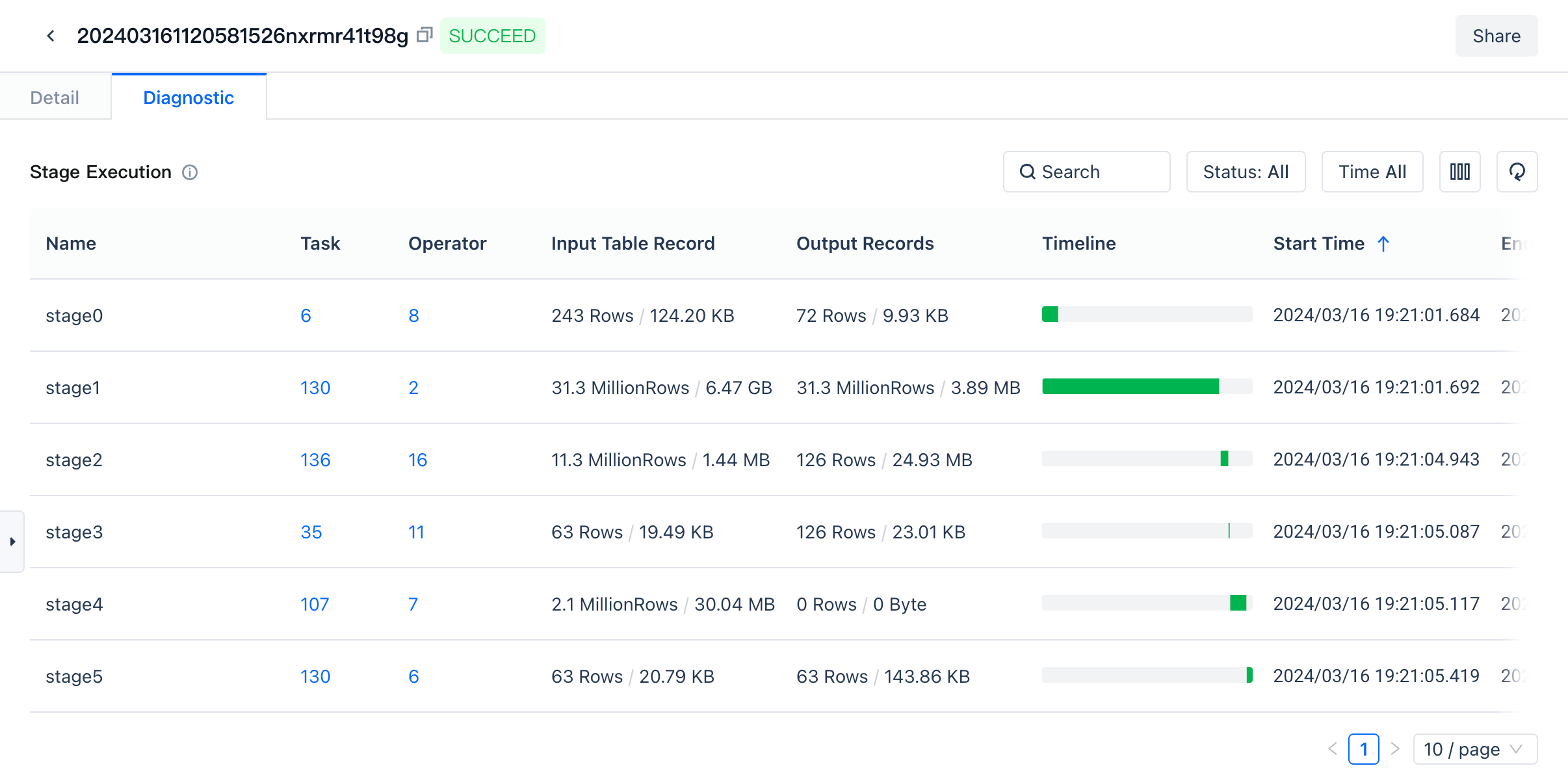 | Start Time | The start time of the stage, stages in the analytical cluster will run simultaneously |
