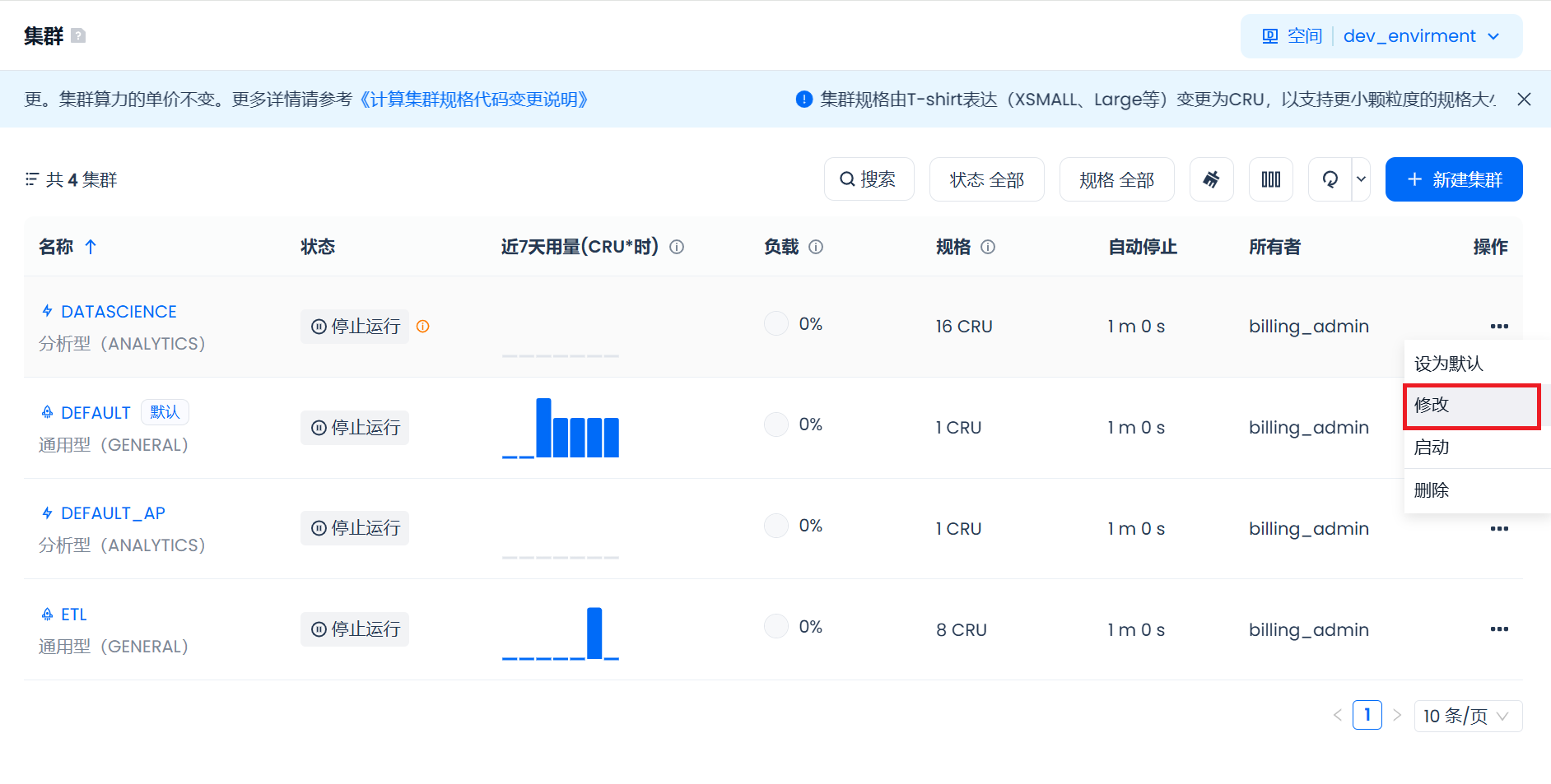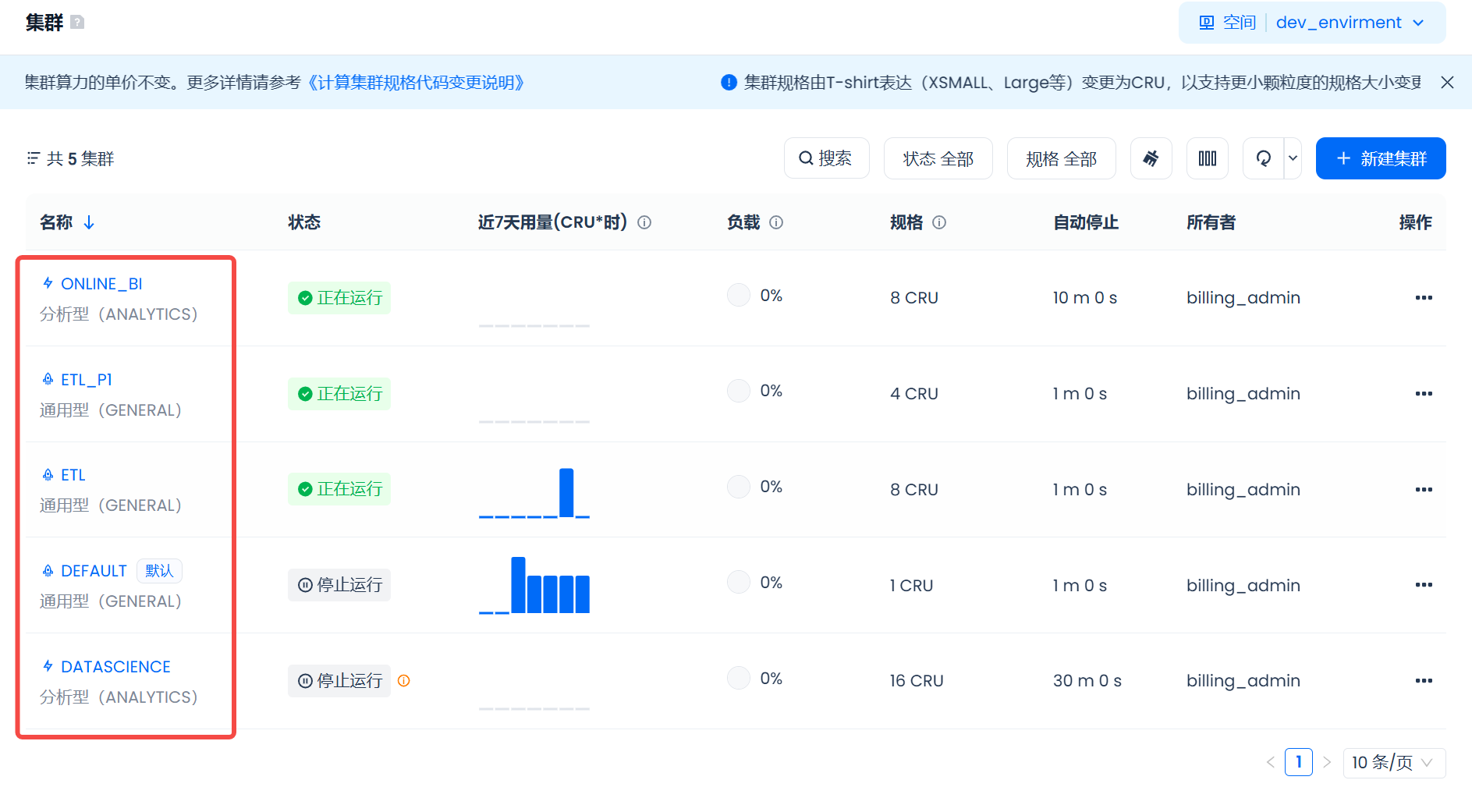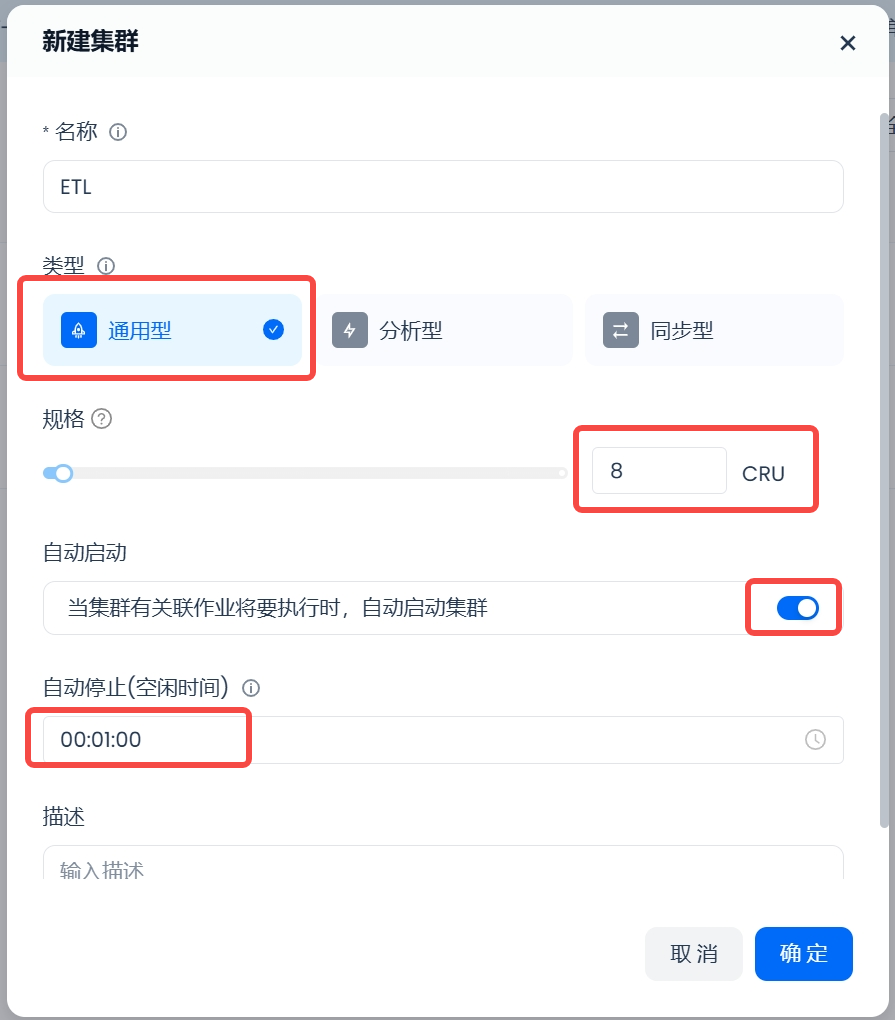 - ETL dedicated cluster: Use a general-purpose computing cluster, configure specifications that meet job SLA expectations based on business needs, and set a short auto-pause time to promptly shut down the cluster after job completion to reduce costs. Multiple ETL dedicated clusters can be created to assign ETL tasks with different SLA requirements to different clusters, avoiding resource competition within the same cluster that could affect important task SLAs.