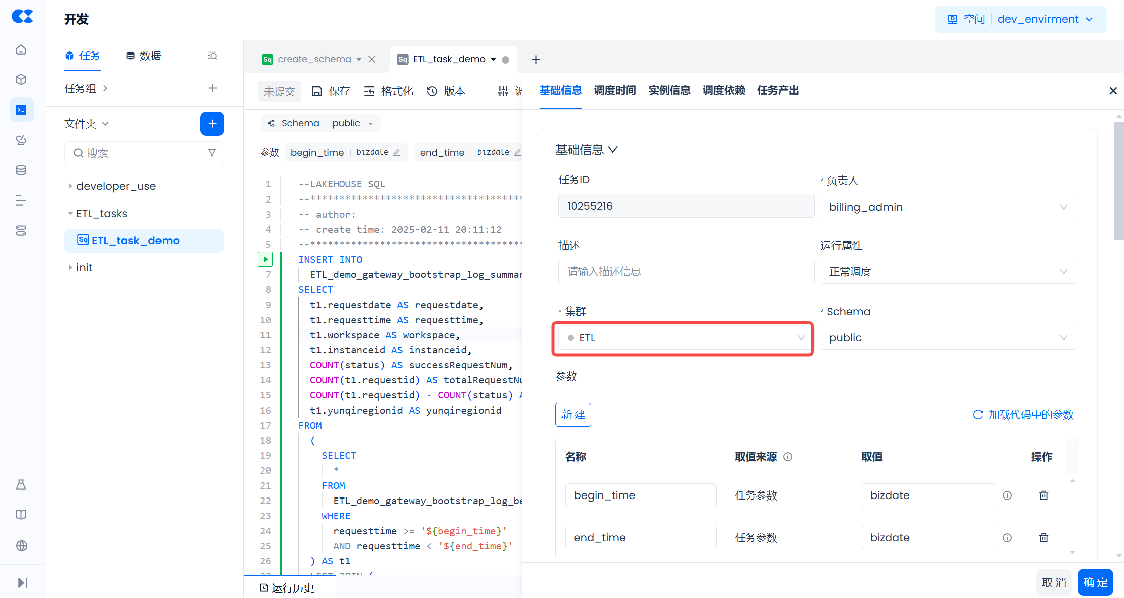 - In the scheduling configuration of the ETL task (ETL_task_demo), configure the computing cluster for task execution to the ETL cluster set in the previous step. For more scheduling configuration operations, refer to the relevant content in the Task Development and Scheduling document.