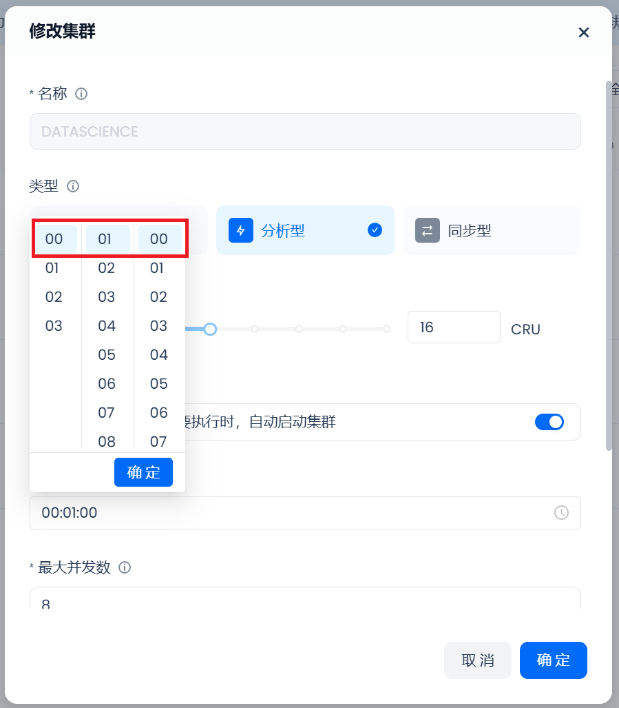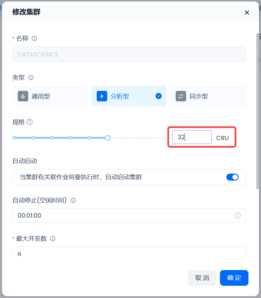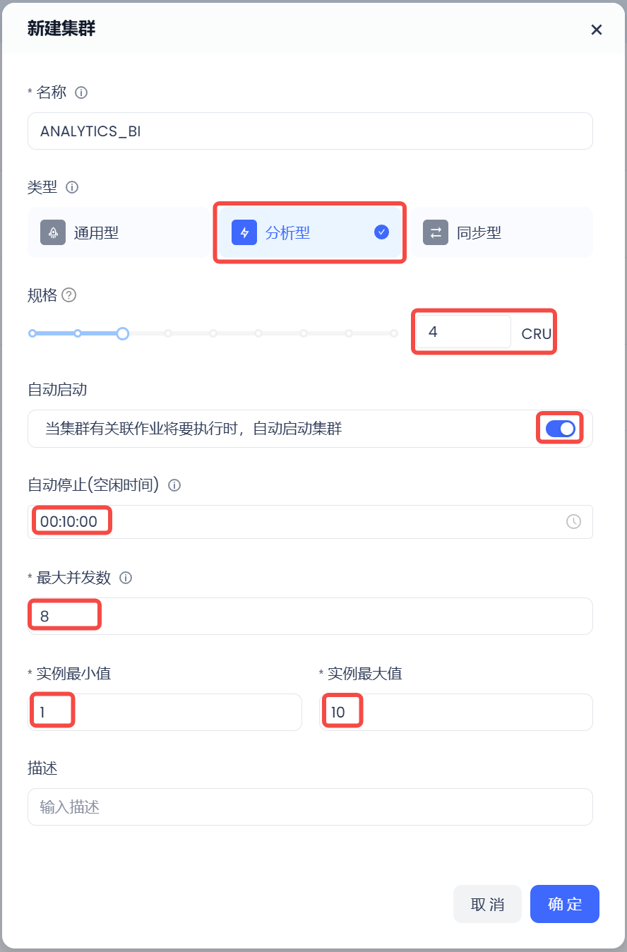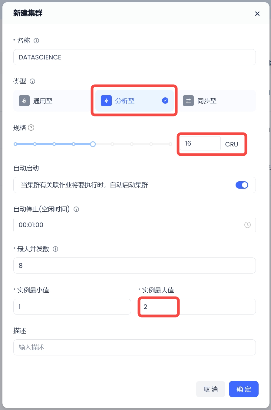1. Create a large-scale analytical computing cluster, such as 16CRU, to enhance computing parallelism and shorten query time. Minimum instance count is 1, maximum instance count is 2, to control costs.