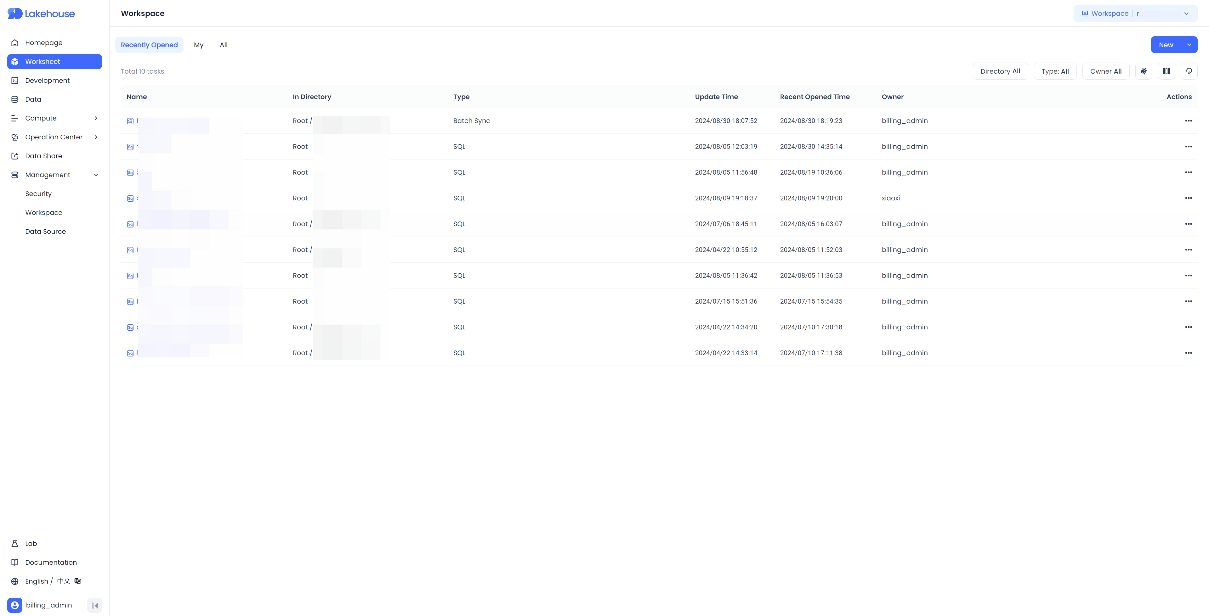 The worksheet manages or operates all task information under the current instance in the form of a list. In the worksheet, you can quickly and easily locate recently opened projects, and it supports users to create new tasks or perform batch operations on tasks within the workspace.