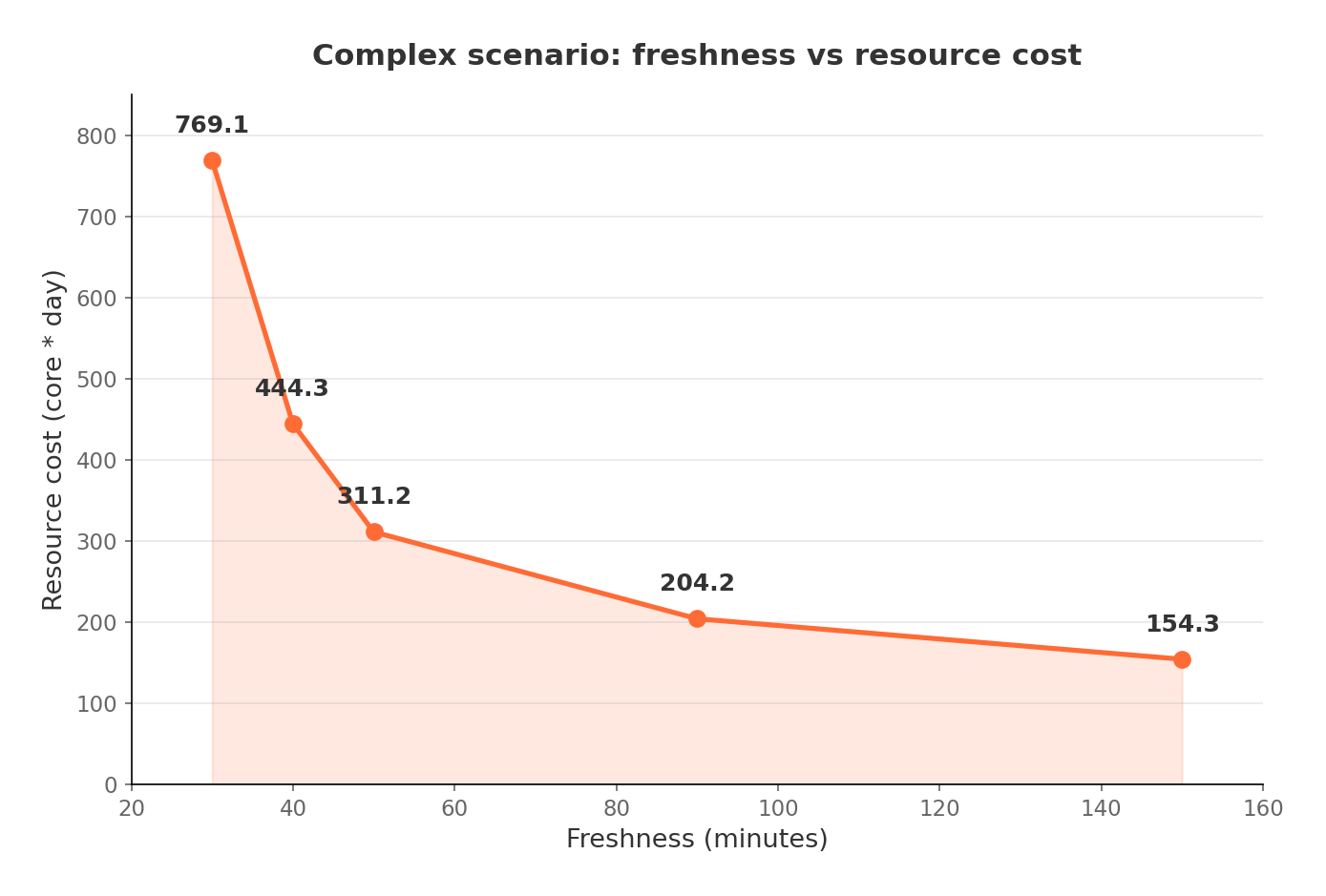 For the complex workload, the fastest achievable freshness was about 30 minutes (across a 4-layer pipeline fed by three large tables). At that aggressive cadence, cumulative resource usage was higher than a single batch run. But at 50-minute intervals the costs were roughly even, and at 90 minutes or above, incremental computing was cheaper.