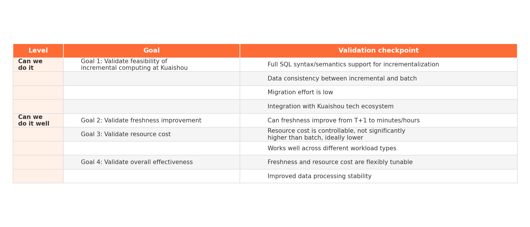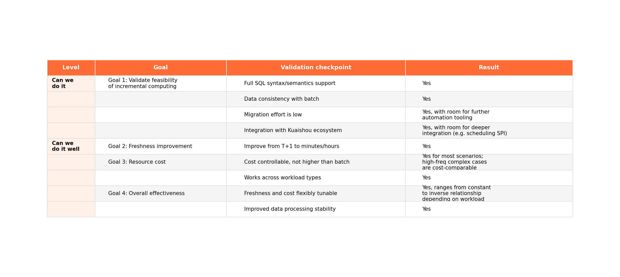 On the feasibility side: does incremental computing work for Kuaishou's real-world SQL workloads, including complex joins, window functions, and UDFs? Does the data match batch results? Can engineers migrate existing pipelines without rewriting everything?