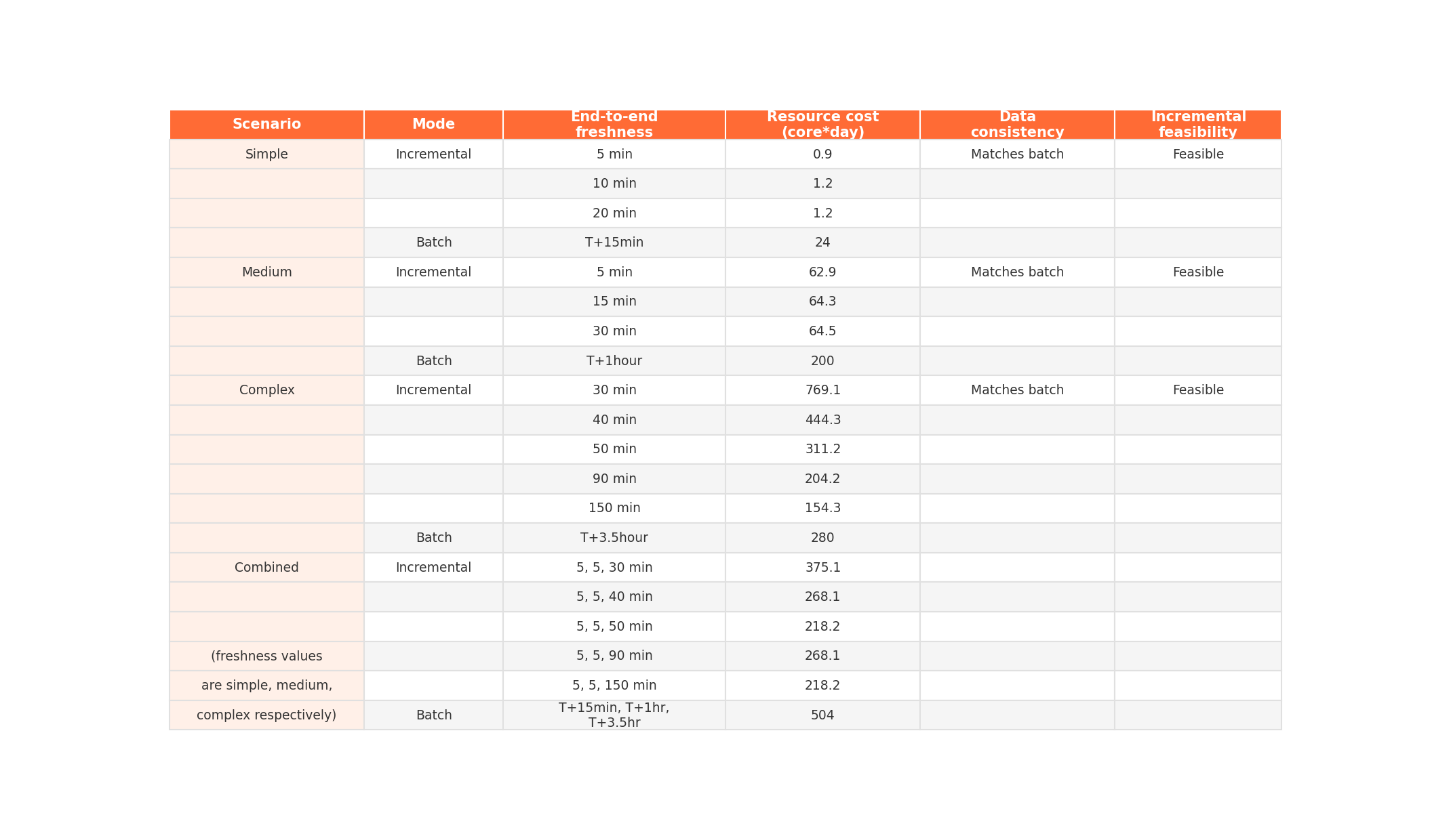 For simple and medium workloads, incremental computing hit 5-minute data freshness (and could go lower). Resource consumption was less than 1/20th of batch for the simple case and under 1/3rd for the medium case.