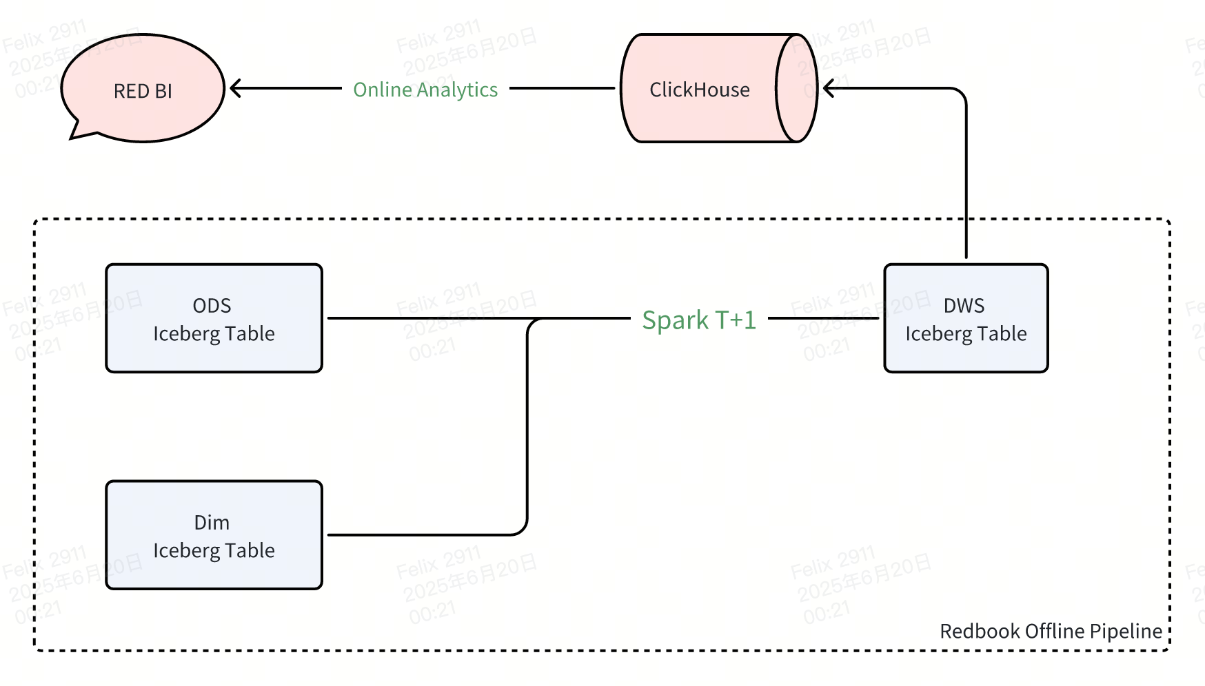 Our existing infrastructure separates offline and real-time metrics into distinct architectural stacks. The offline pipeline ingests ODS data into our data lake, leveraging Spark for daily aggregations before writing DWS tables to ClickHouse. Meanwhile, the real-time pipeline processes Kafka streams through Flink, writing detailed DWD data directly to ClickHouse with necessary sampling to manage volume.