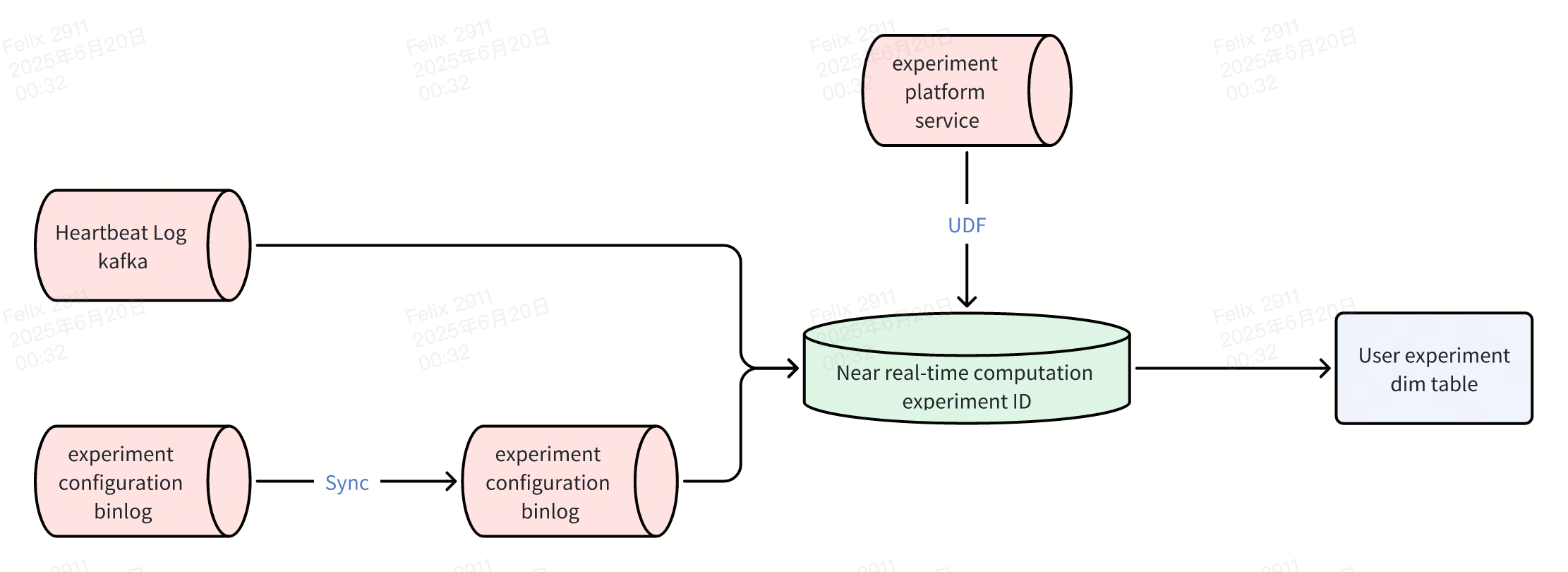 Computing user experiment groups requires only two pieces of information: user ID and experiment configuration information, with only experiment configuration changing in real-time. Therefore, we encapsulated experiment ID calculation processes within UDFs, using heartbeat logs to compute current user experiment group IDs. Calculated experiment group information stores in Singdata's user experiment dimension tables, enabling various near real-time business applications without repeated computation.