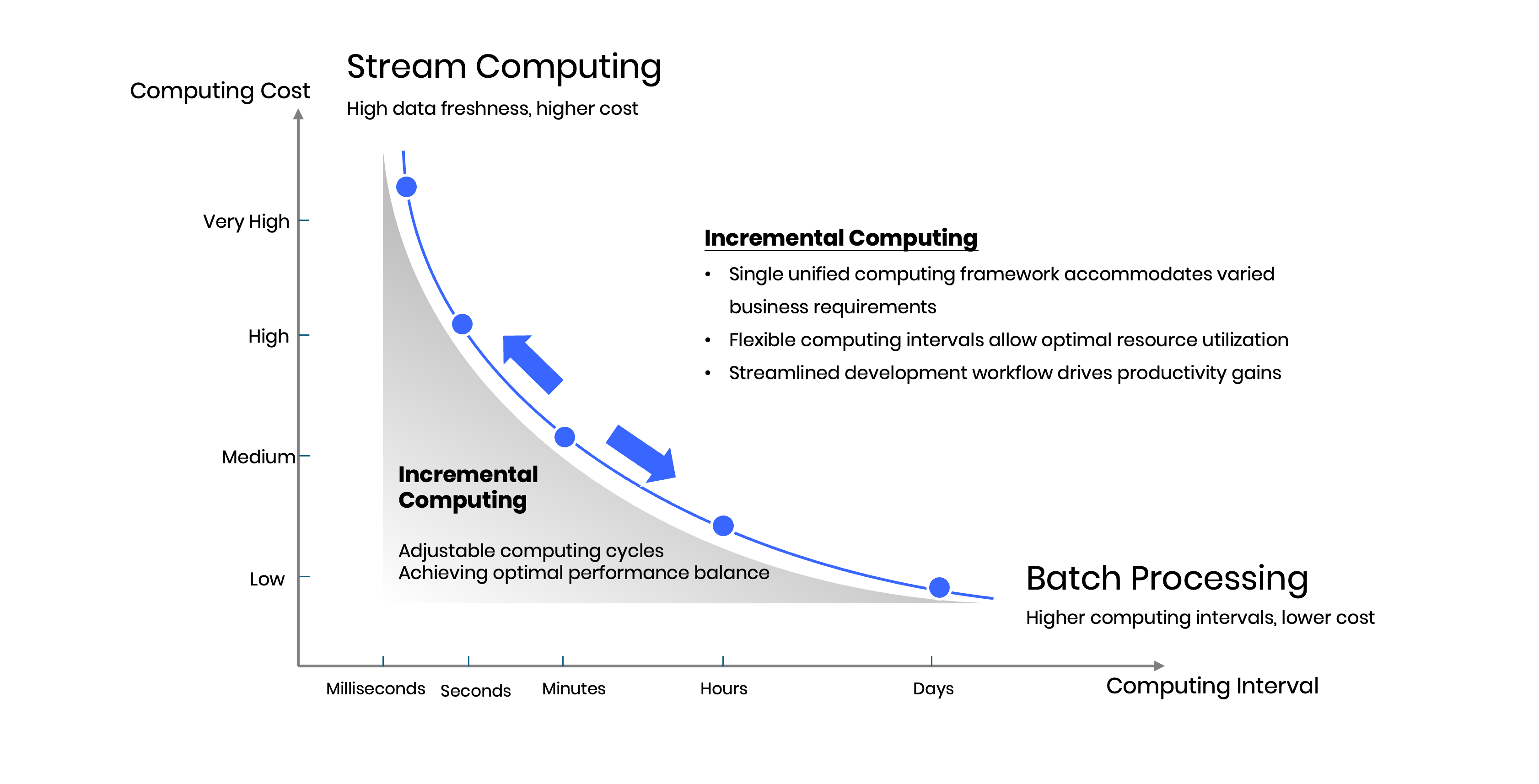Enter incremental compute—a paradigm that processes only data deltas while maintaining minute-level freshness. By dynamically compute changes and merging results with previous states, it bridges the gap between batch economics and streaming responsiveness. This approach enables flexible scheduling intervals, distributes computational load to avoid resource contention, and fundamentally reimagines the stream-batch dichotomy.