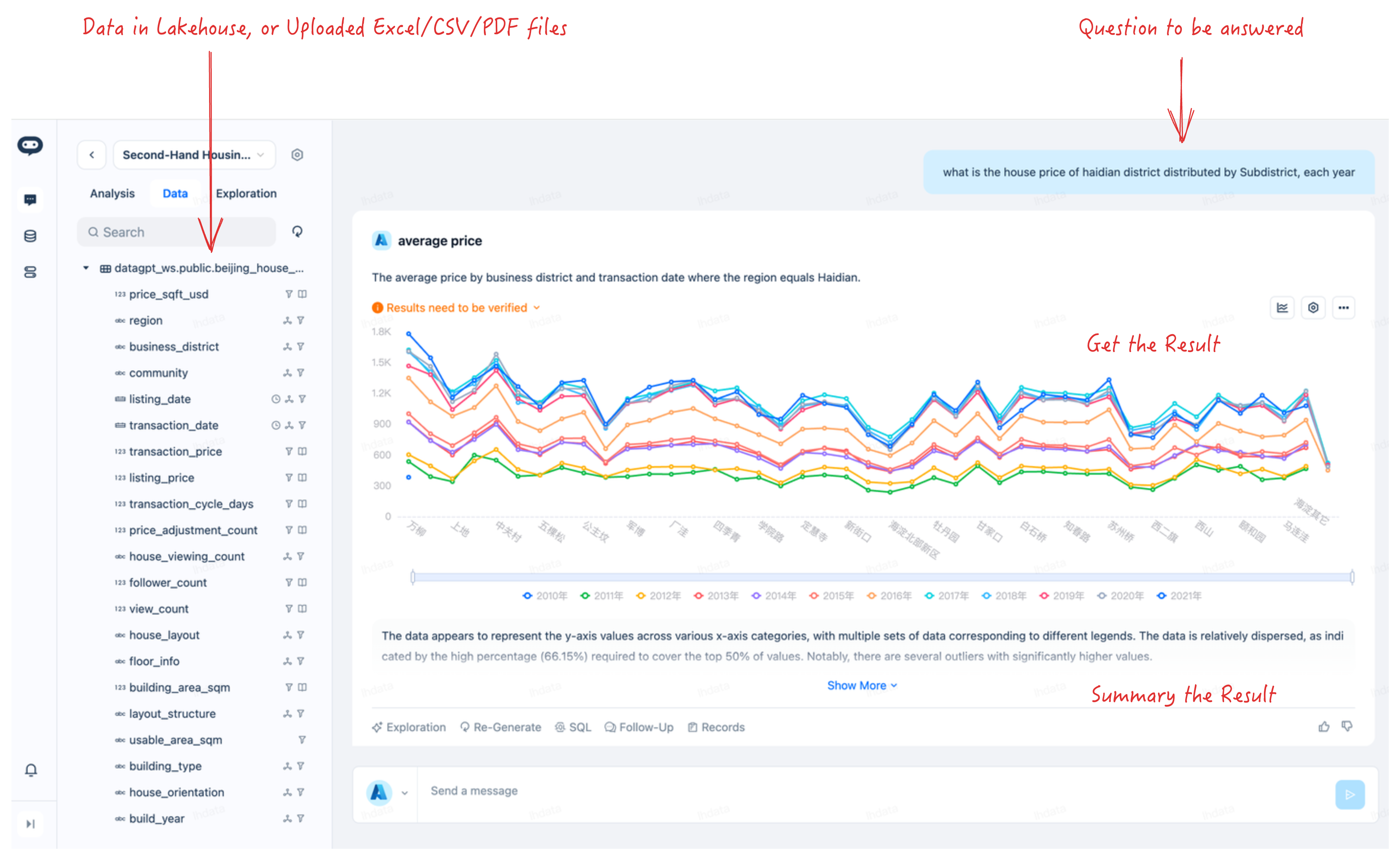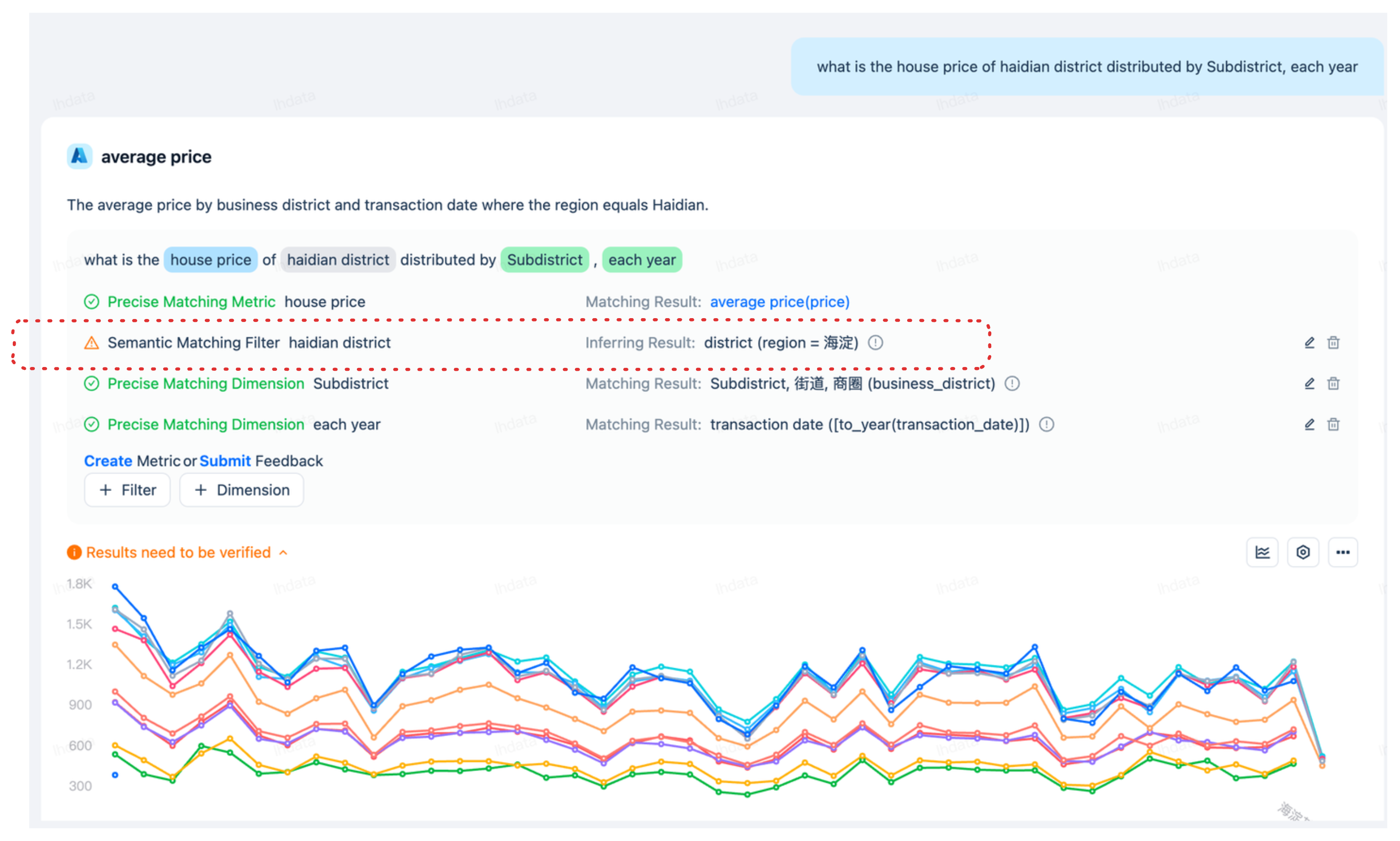 We received a notification indicating that "Results need to be verified." Upon investigating the details, we discovered that the query related to the "Haidian District." The Large Language Model (LLM)-powered data analysis tool, DataGPT, adeptly managed the multilingual nature of the data by interpreting "Haidian District" and correlating it with the Chinese field value "Haidian" for the region, as the table only contains district information in Chinese. DataGPT's inference capabilities enabled it to recognize the matching correlation and seamlessly align the data to yield accurate outcomes. Despite this, the tool prompted the user to verify the results for accuracy.