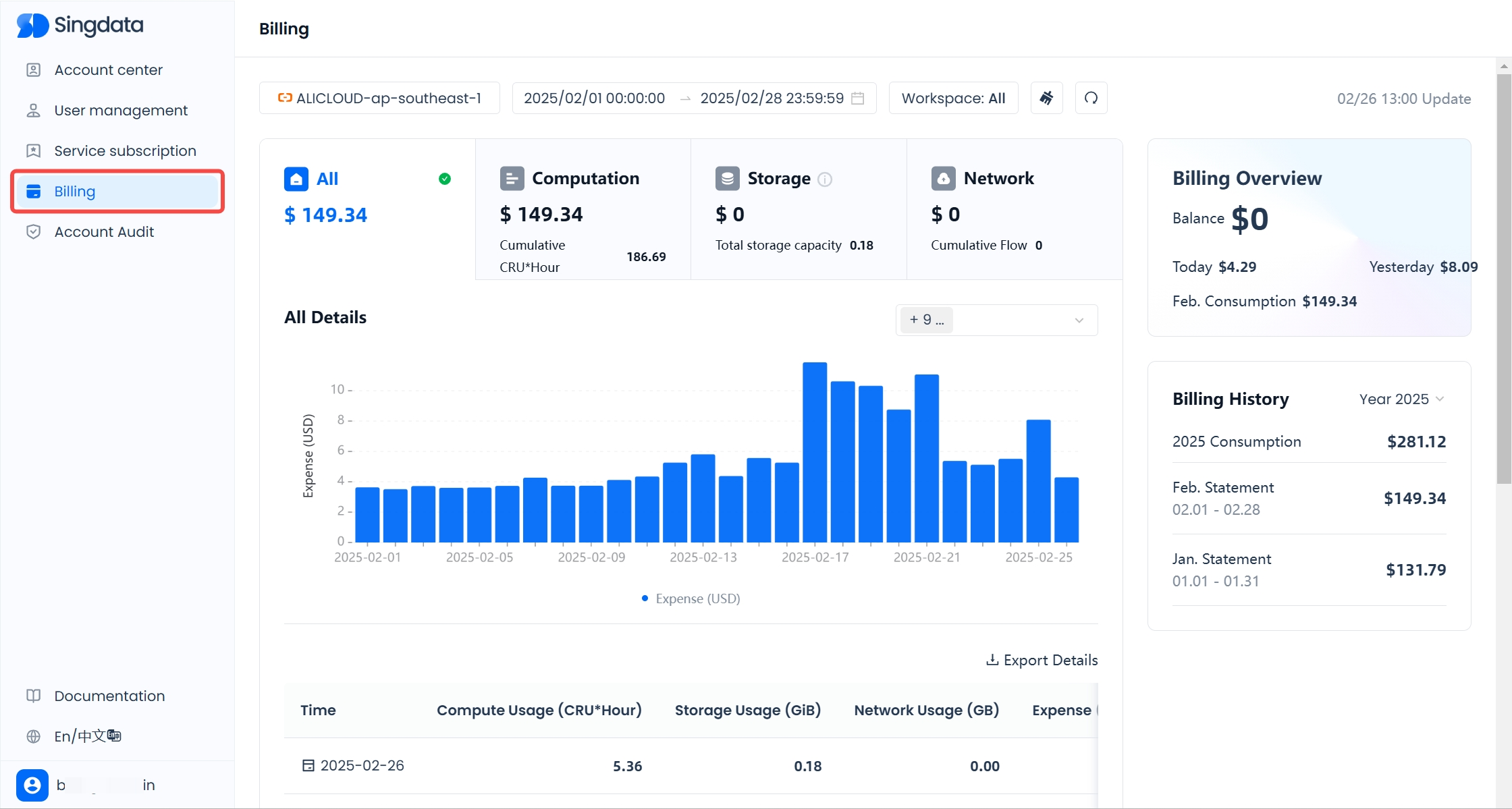 When you log in with an user that has the account administrator role,You can view your account’s usage records under the Billing feature in the Account Center (<your_accounts_name>.accounts.singdata.com/billing) . You can also query detailed costs by SKU type—such as compute, storage, network, or specific SKUs.