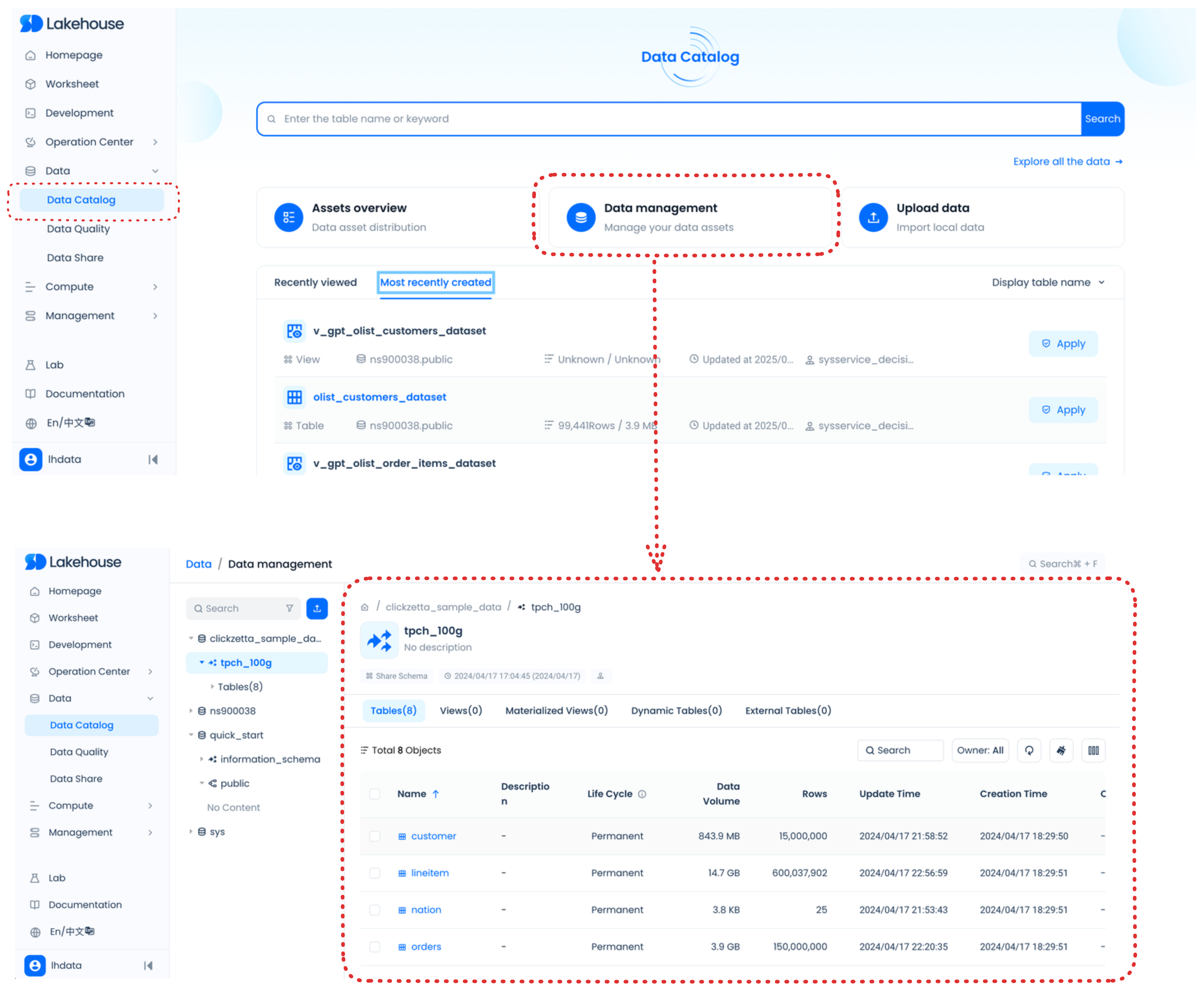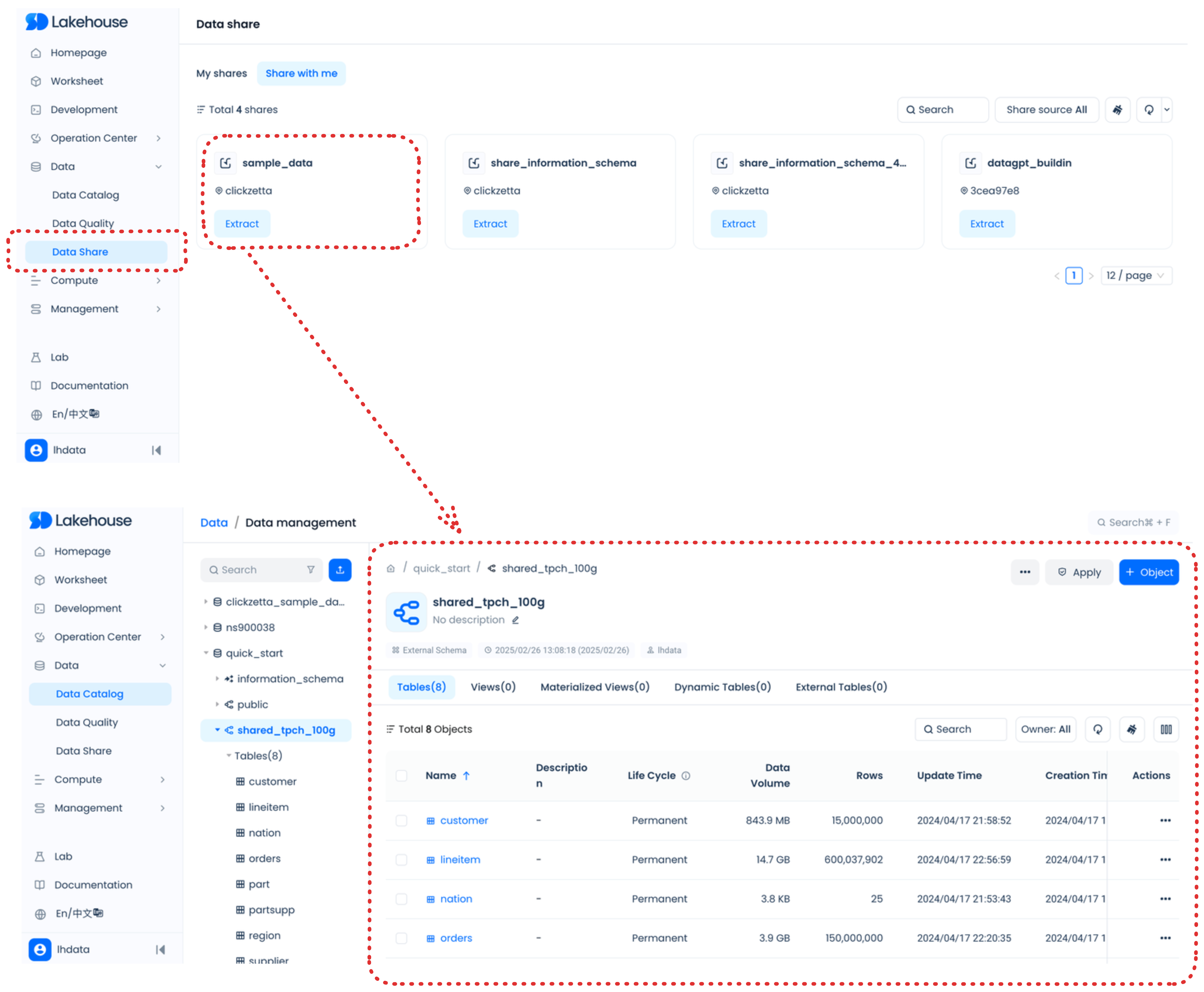 You can explore and manage your datalake/database objects in Singdata Lakehouse Studio as follows: