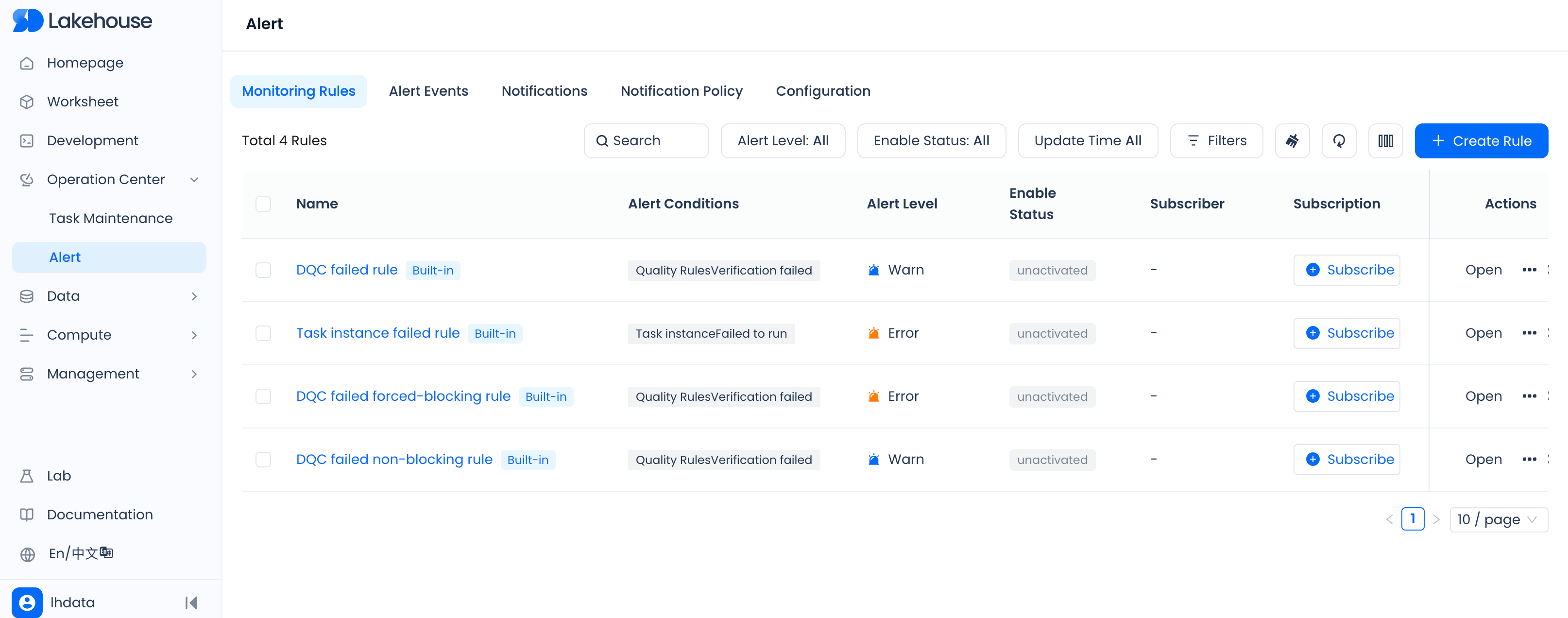 The monitoring feature enables you to keep an eye on abnormal occurrences, such as task execution status, by utilizing built-in rules or custom configuration settings, and it will dispatch alert notifications as needed.