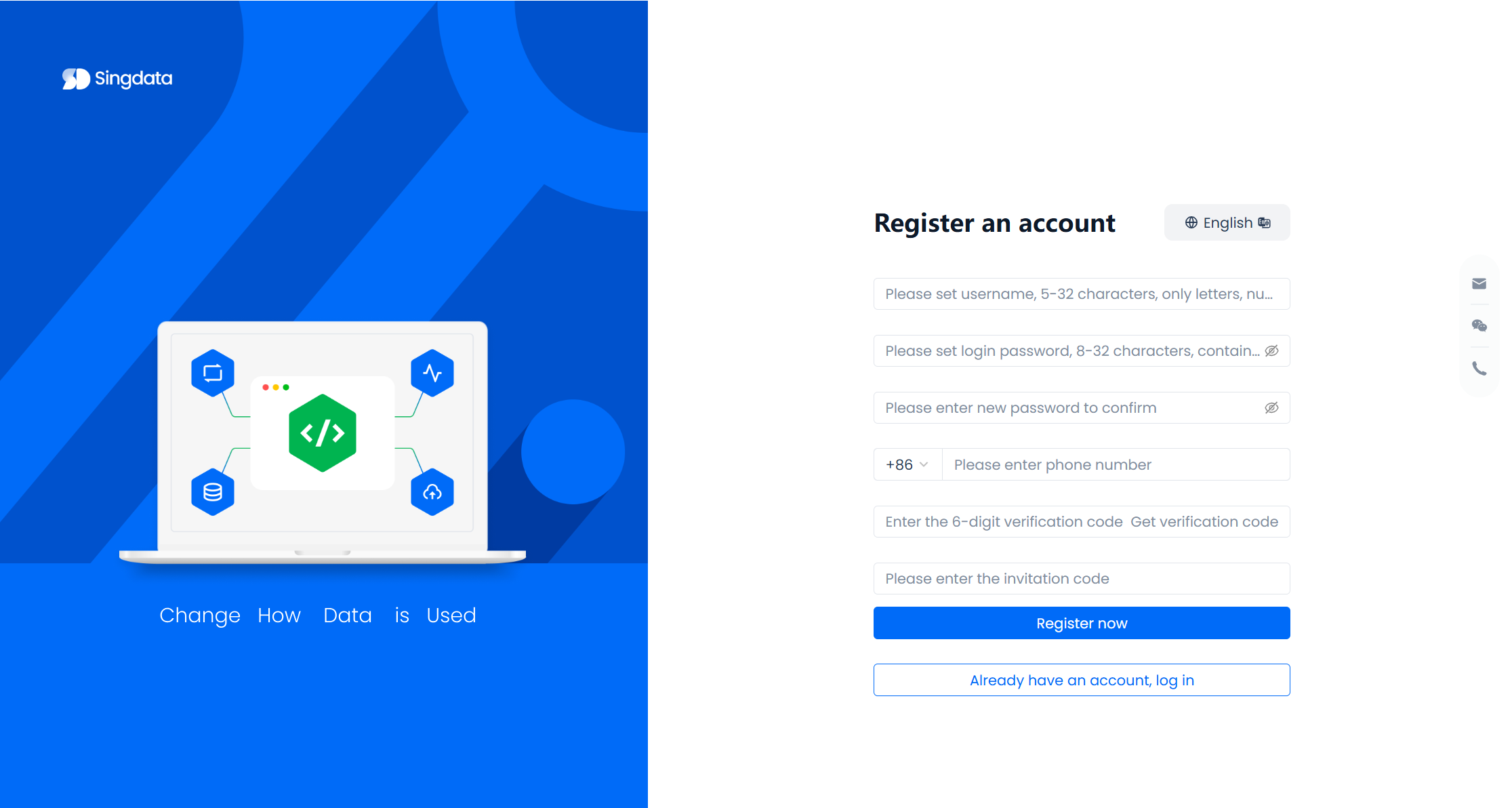 Before using Singdata services, you must create an account. Currently, a registration code (invitation code) is required. After obtaining the registration code by contacting our sales team, you can visit https://accounts.singdata.com/register to sign up.