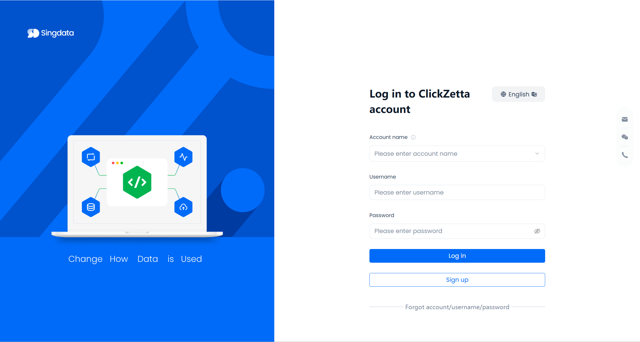 Using the General Login Page: Go to https://accounts.singdata.com/login to log in. Enter your 8-digit account name (shown when you completed registration), then click “Login” to be directed to the account’s login page. In the login prompt, enter the correct username and password, then click “Login.”