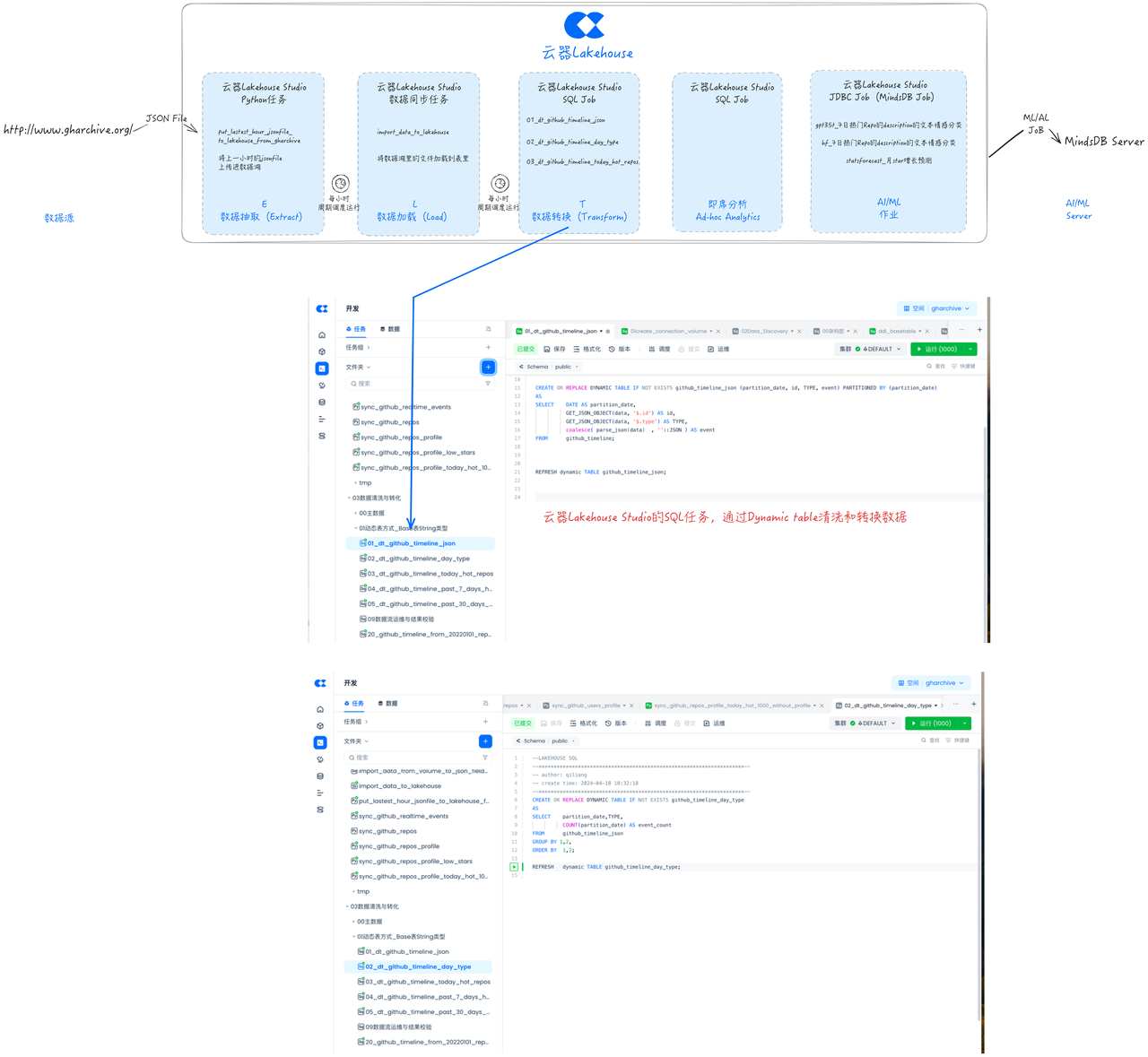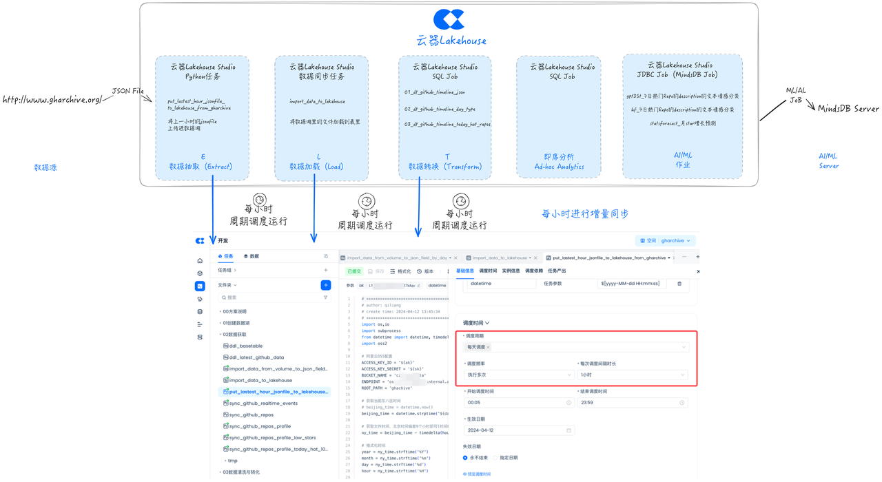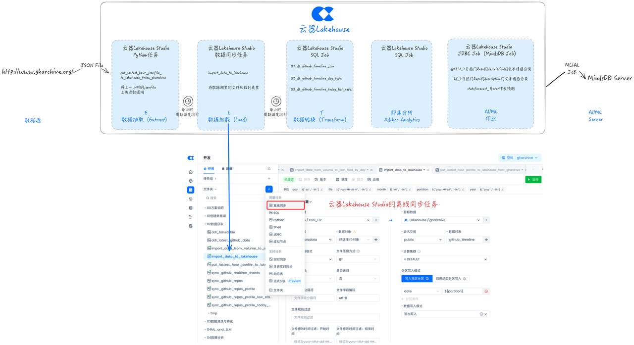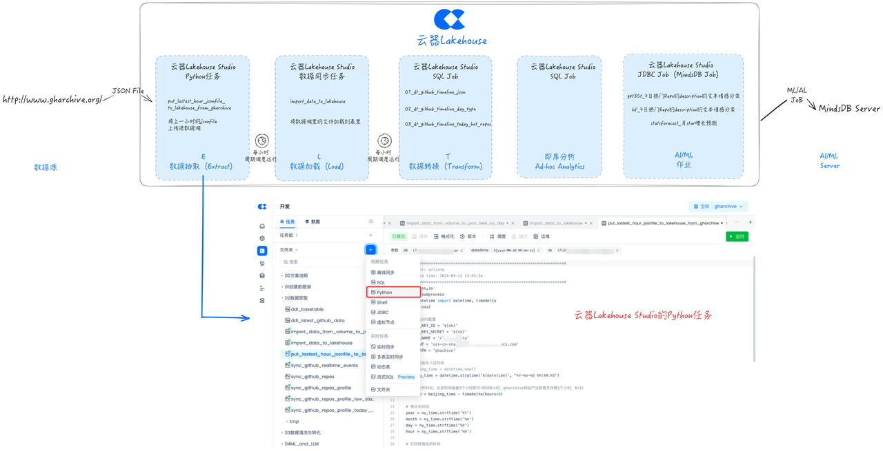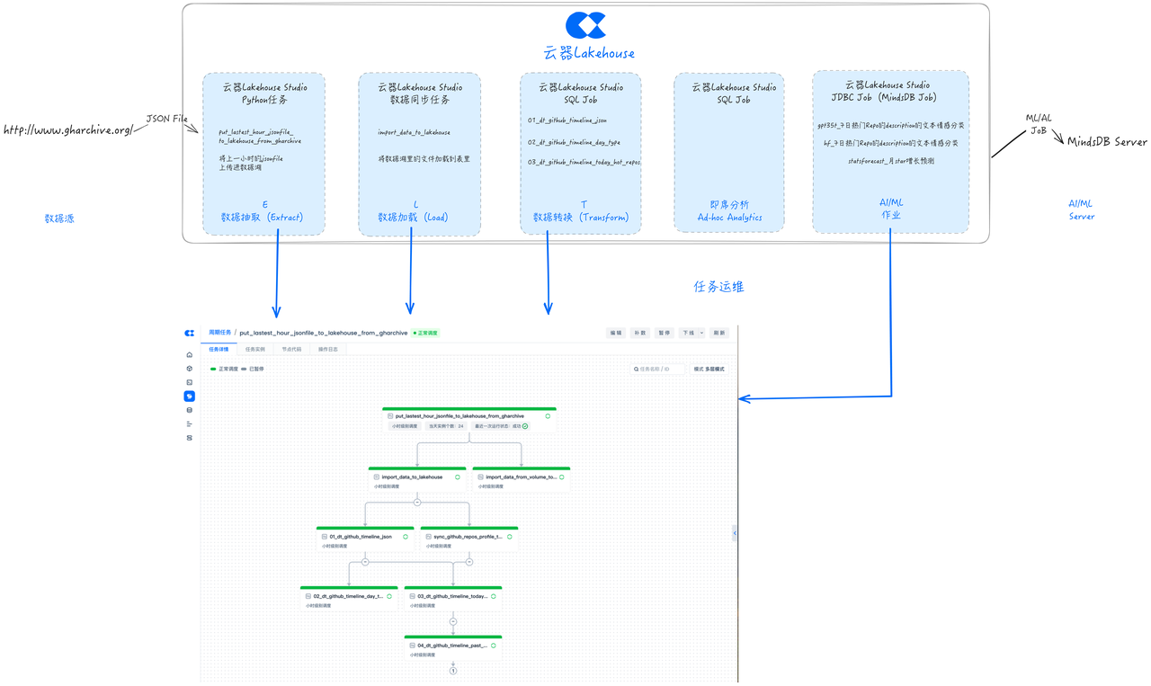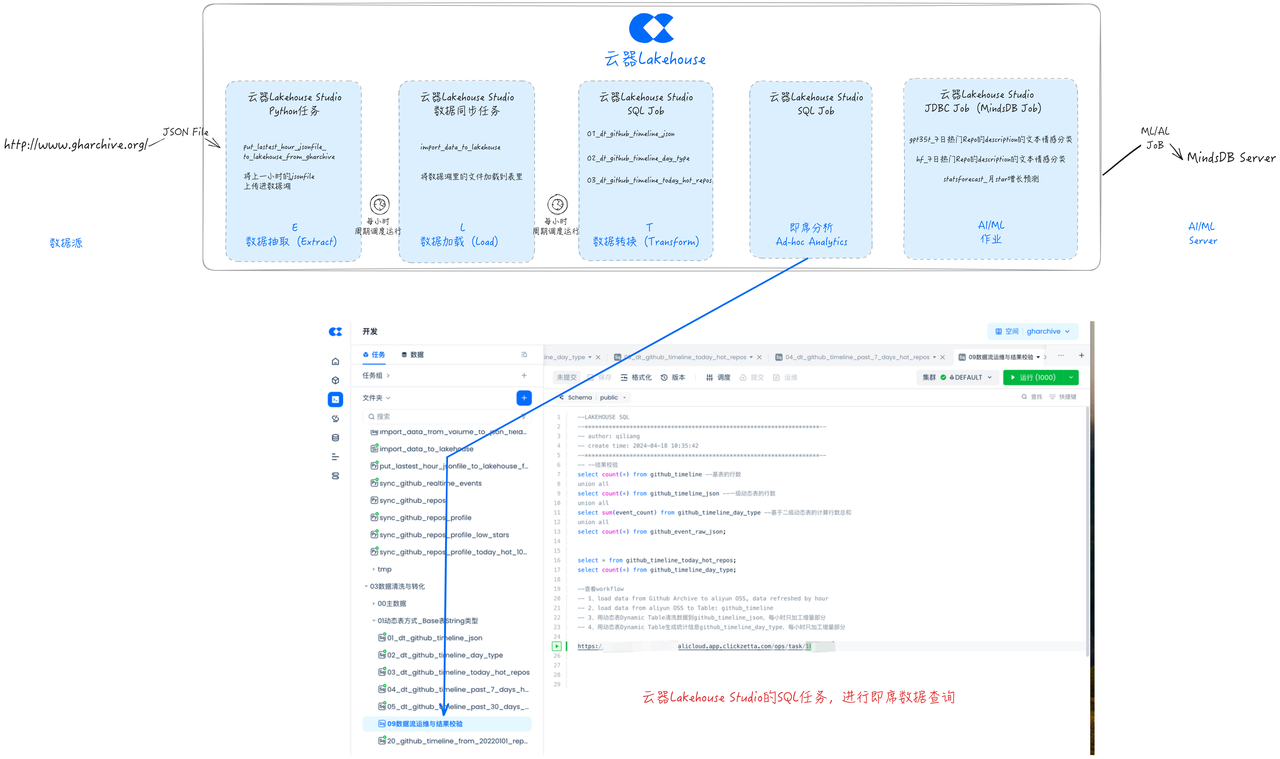 - Application Case: Using GHArchive data as an example, it demonstrates data extraction, loading, cleaning and transformation, ad hoc data analysis, AI/ML enhanced analysis, incremental synchronization task scheduling, full data supplementation, and task operations and maintenance.