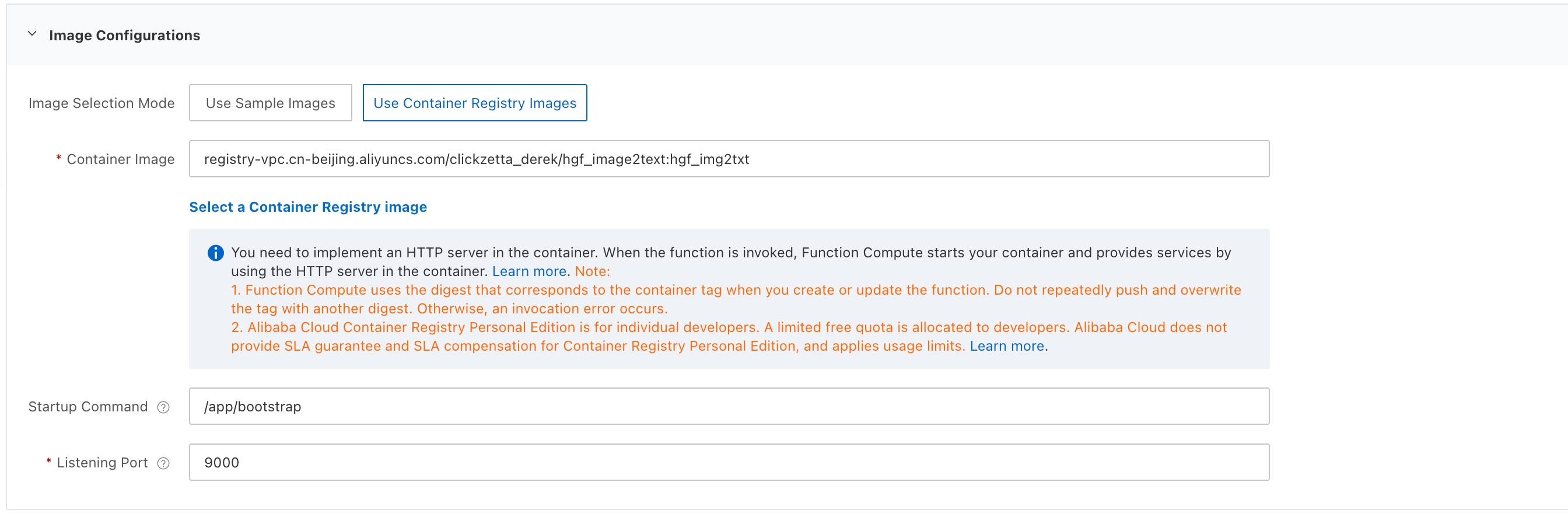 - In Image Configuration, select Use Image from ACR, choose the image from ACR, Startup Command: