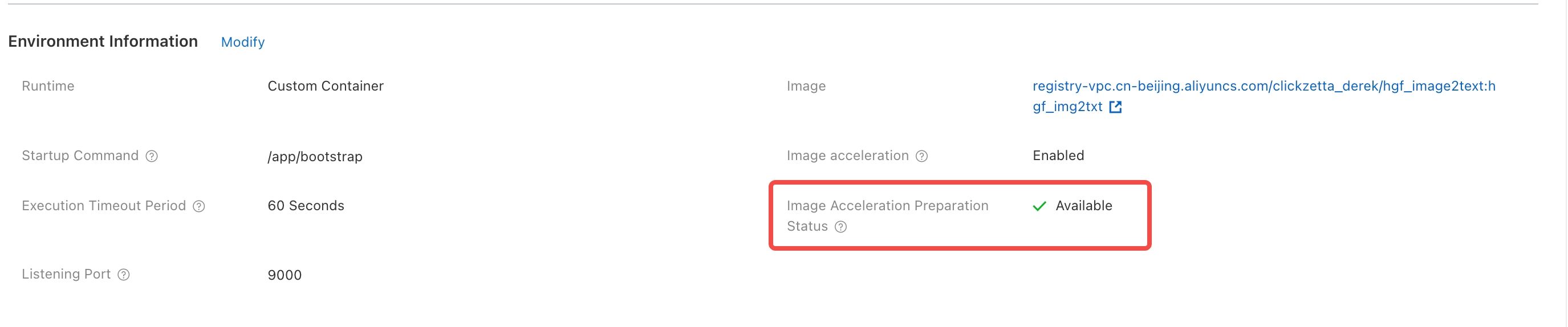 - In the Function List, enter the created function -> Function Configuration, Check Image Acceleration Preparation Status, wait until it shows "Available"