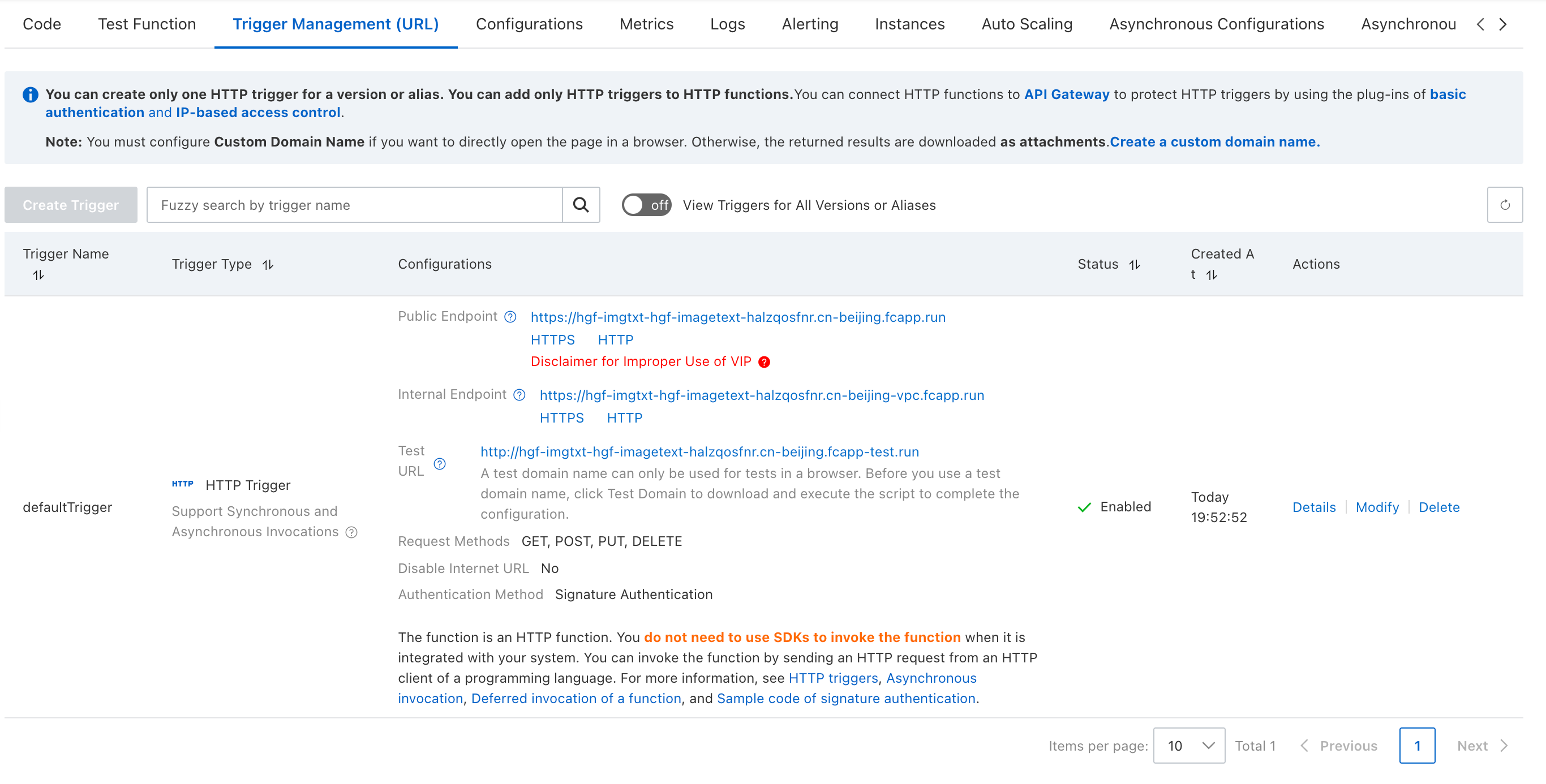- Go to Trigger Management, obtain the HTTP link for public network access