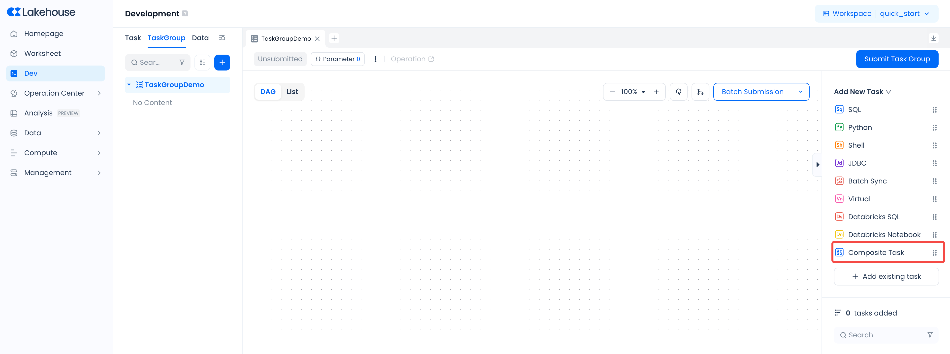 - Task groups are a logical management concept that allows multiple tasks to be placed within a group for unified display and orchestration. Composite tasks are task type entities that exist at the same level as regular SQL tasks. Composite tasks can be added as elements within task groups.