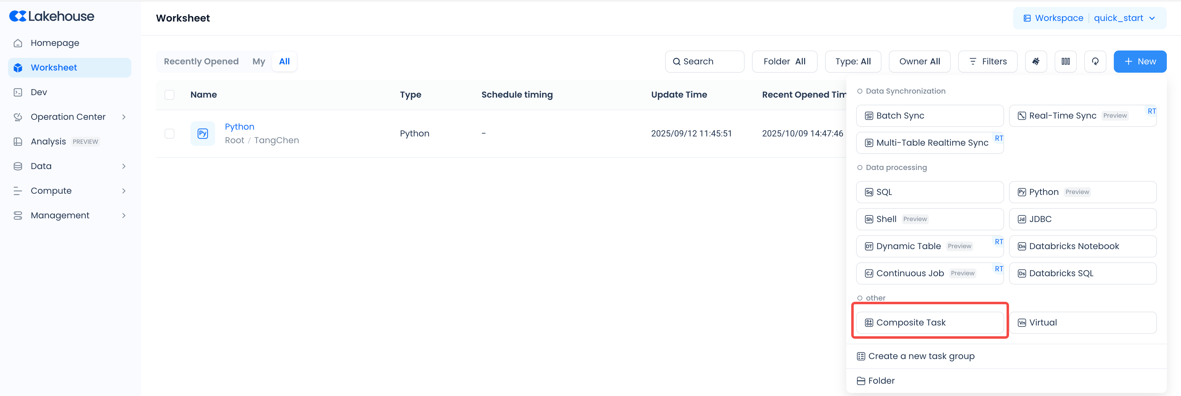 Workspace: Top Navigation Bar → New Task → Select "Composite Task"