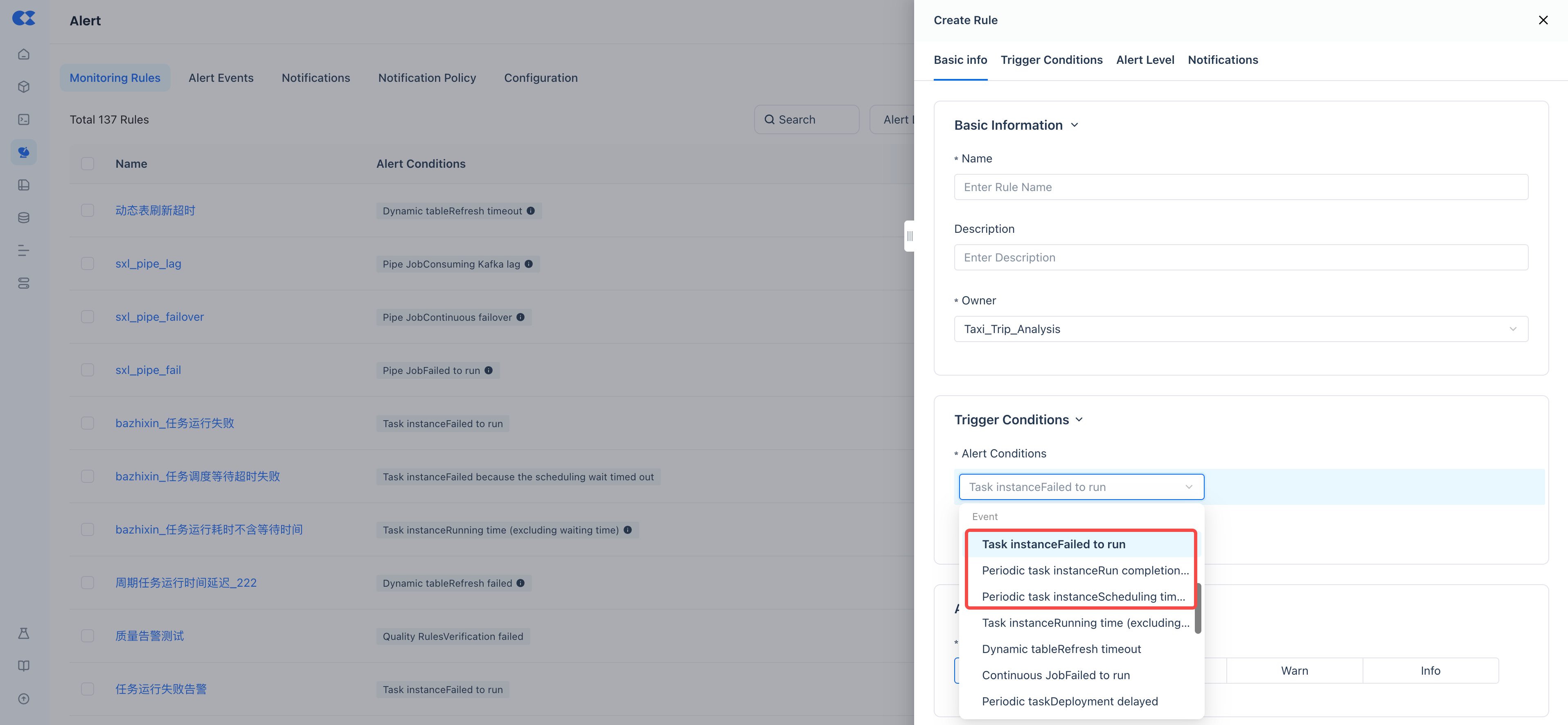 In monitoring and alerting, composite tasks are categorized under periodic scheduling tasks. Existing monitoring items such as "Task Instance Execution Failure" and "Periodic Task Instance Completion Time" apply to them as well. Similar to regular SQL periodic tasks, monitoring rules can be configured to monitor their execution status and duration.