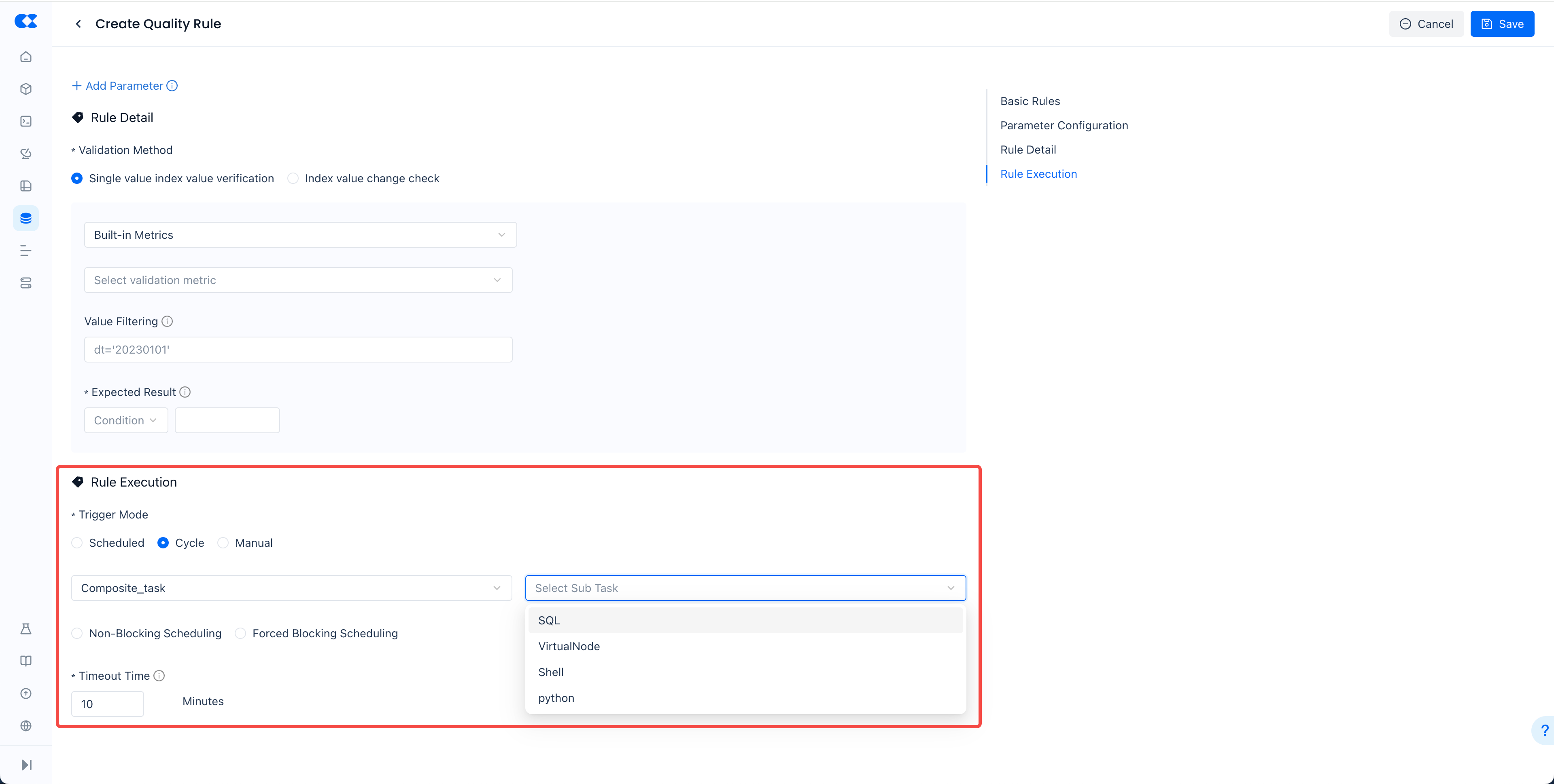 | Scheduling Time | Required, supports Cron expressions (subtasks cannot set independently) | None (subtasks follow the composite task's global scheduling time for synchronous execution) |
