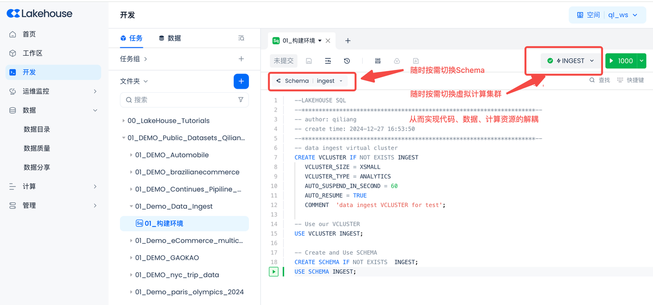 Create a Schema named INGEST and a virtual compute cluster in your Singdata Lakehouse account.
