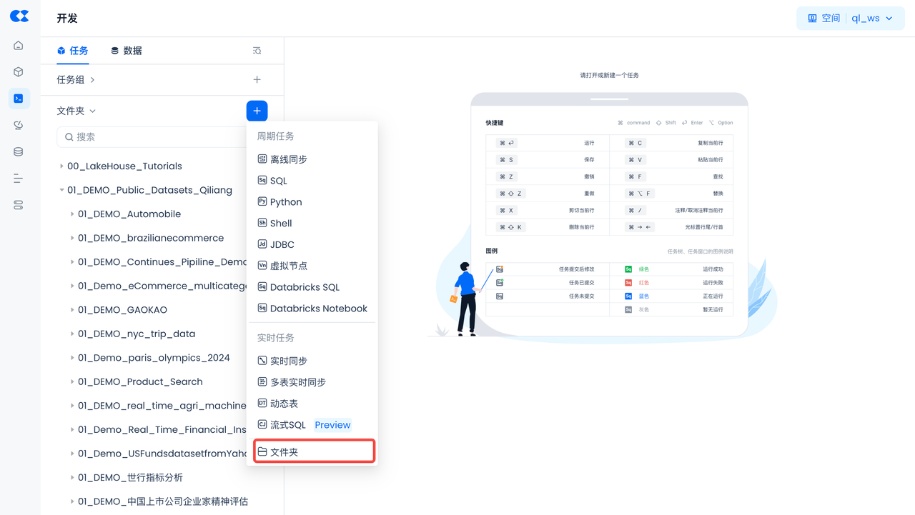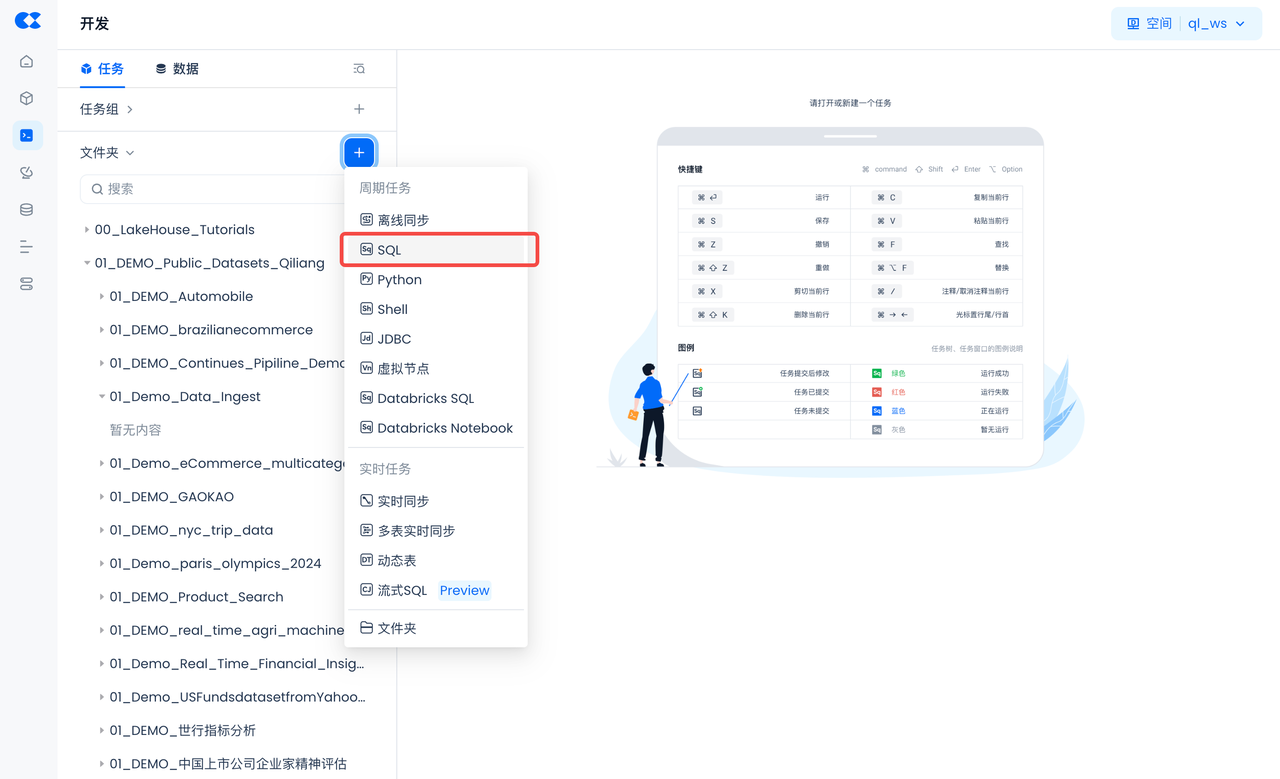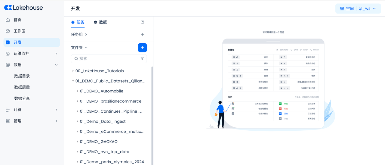 Copy and paste the following SQL script to create Singdata Lakehouse objects (virtual compute cluster, database Schema), then click "Run" at the top of the worksheet (you can also download this file directly).