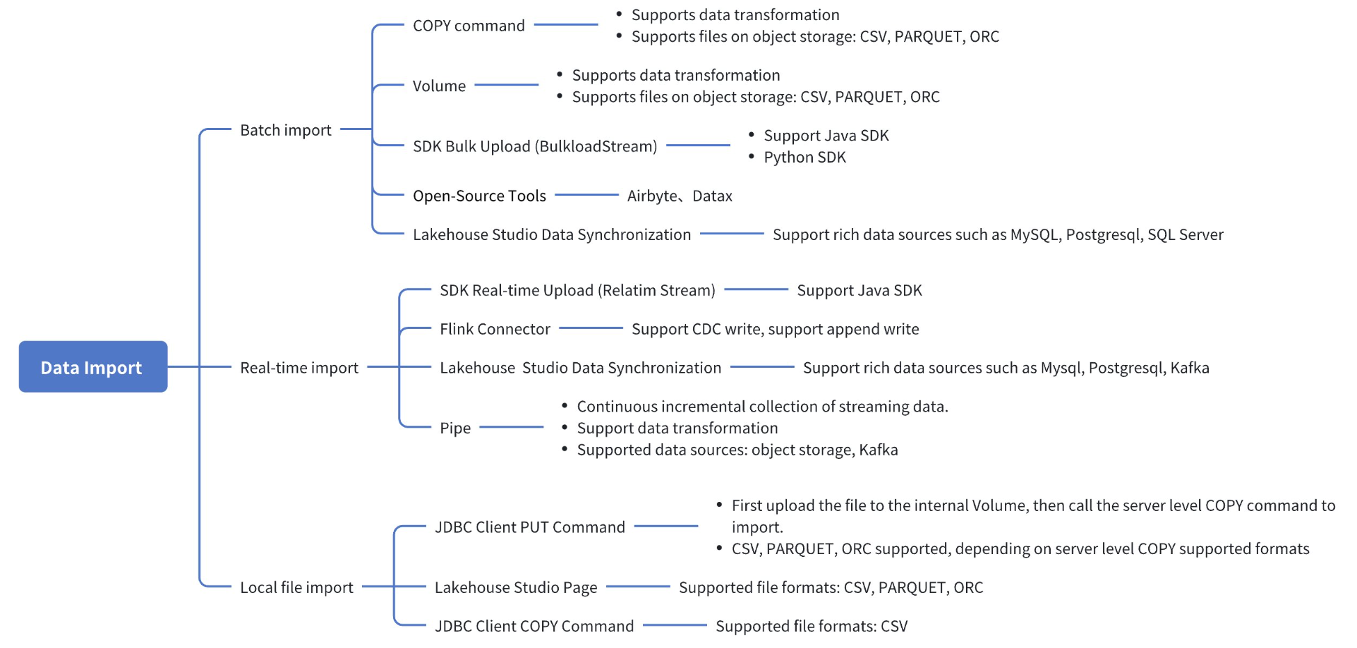 - Import Methods: Supports various data import methods, such as the COPY command, Volume, offline data integration import, and SDK bulk upload (BulkloadStream).