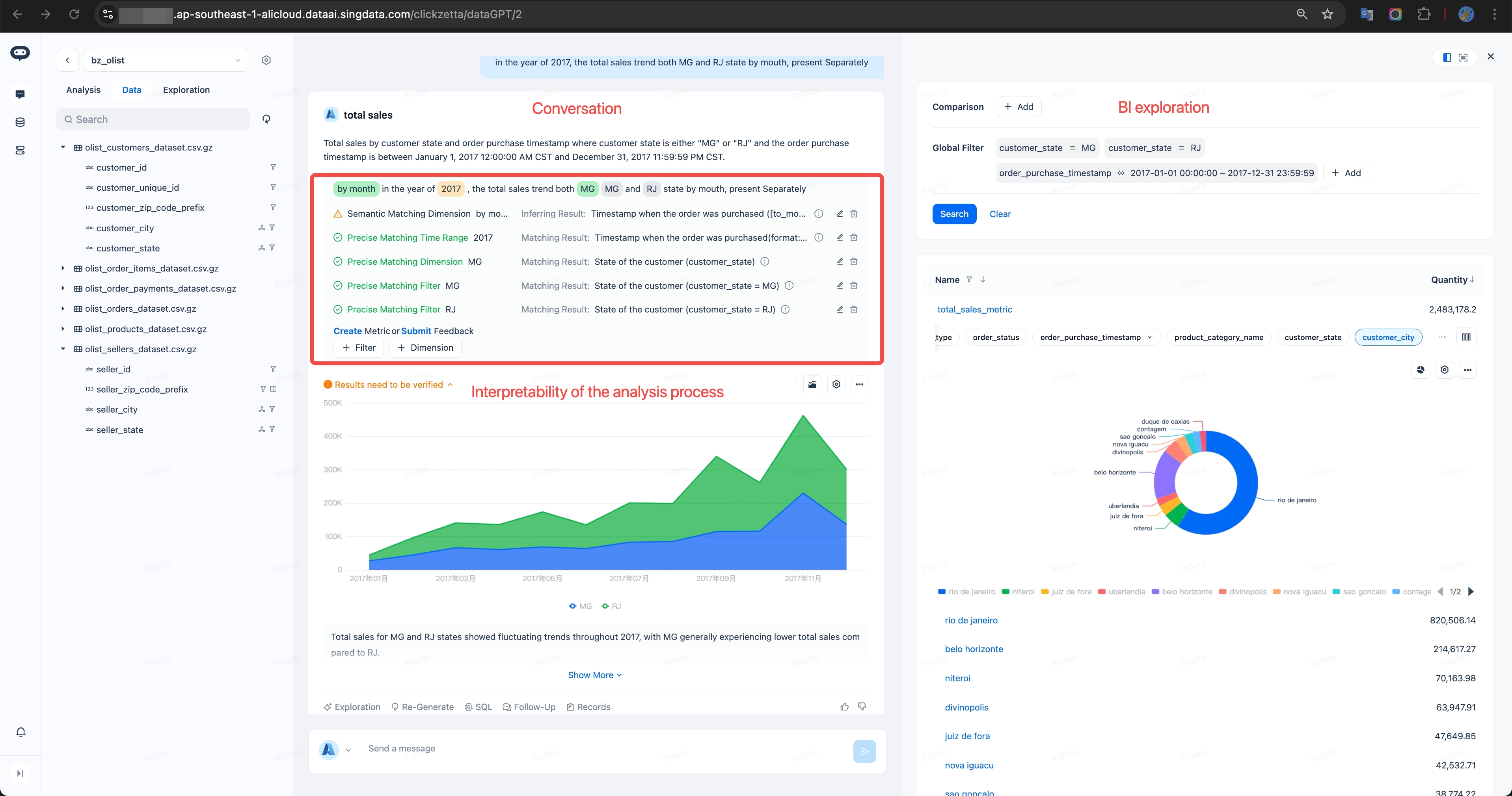 - Combines conversational interaction with traditional BI exploration to enhance data analysis efficiency and Emphasizes the interpretability of the analysis process, providing business personnel with clear result validation evidence.