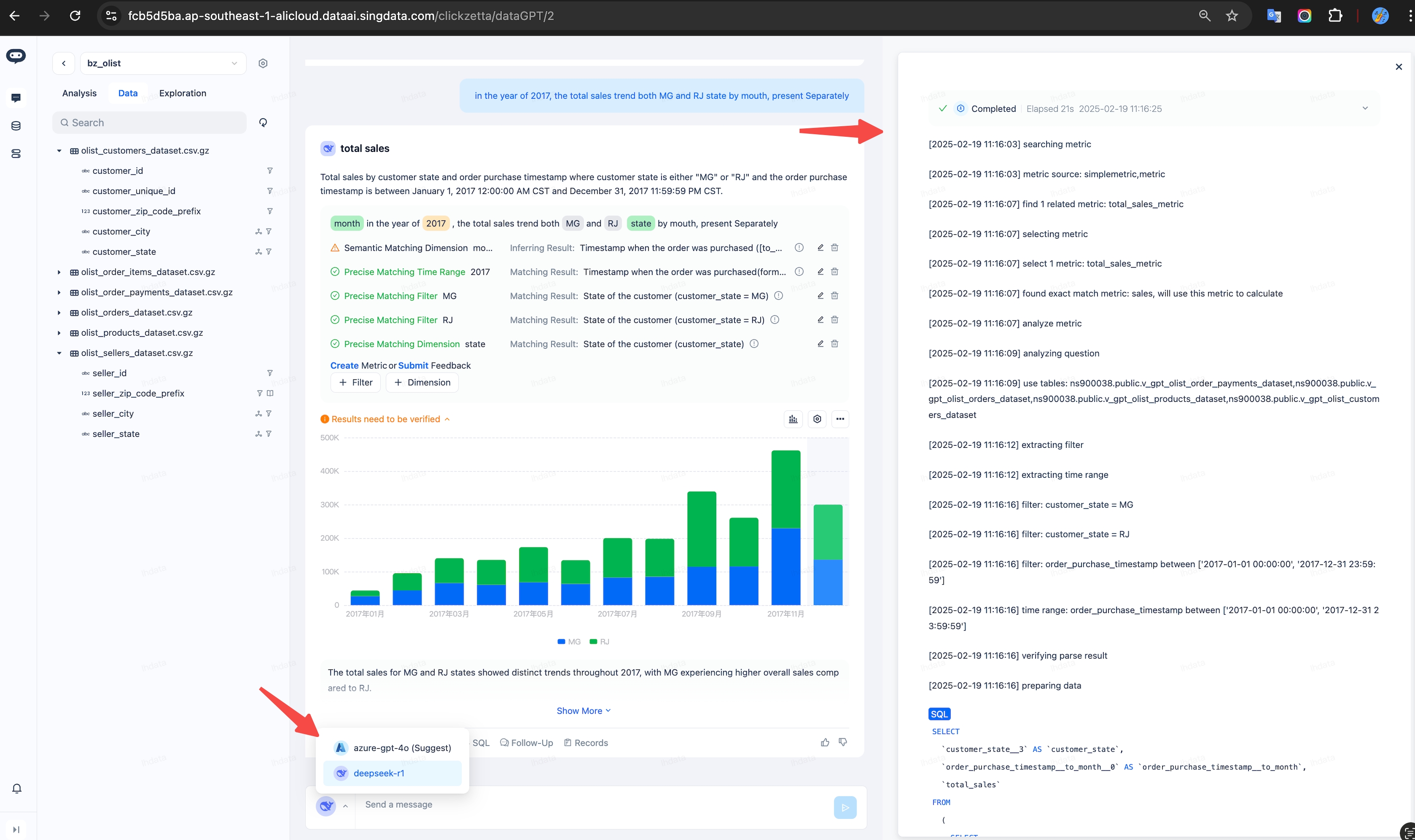 - Utilizes multi-model collaboration to continuously optimize response efficiency and accuracy during the Q&A process: users can choose different models (such as Azure-gpt-4o and Deepseek-R1) to handle query or analysis tasks. The system provides open-source models for private deployment to summarize questions, ensuring data does not leave the service.