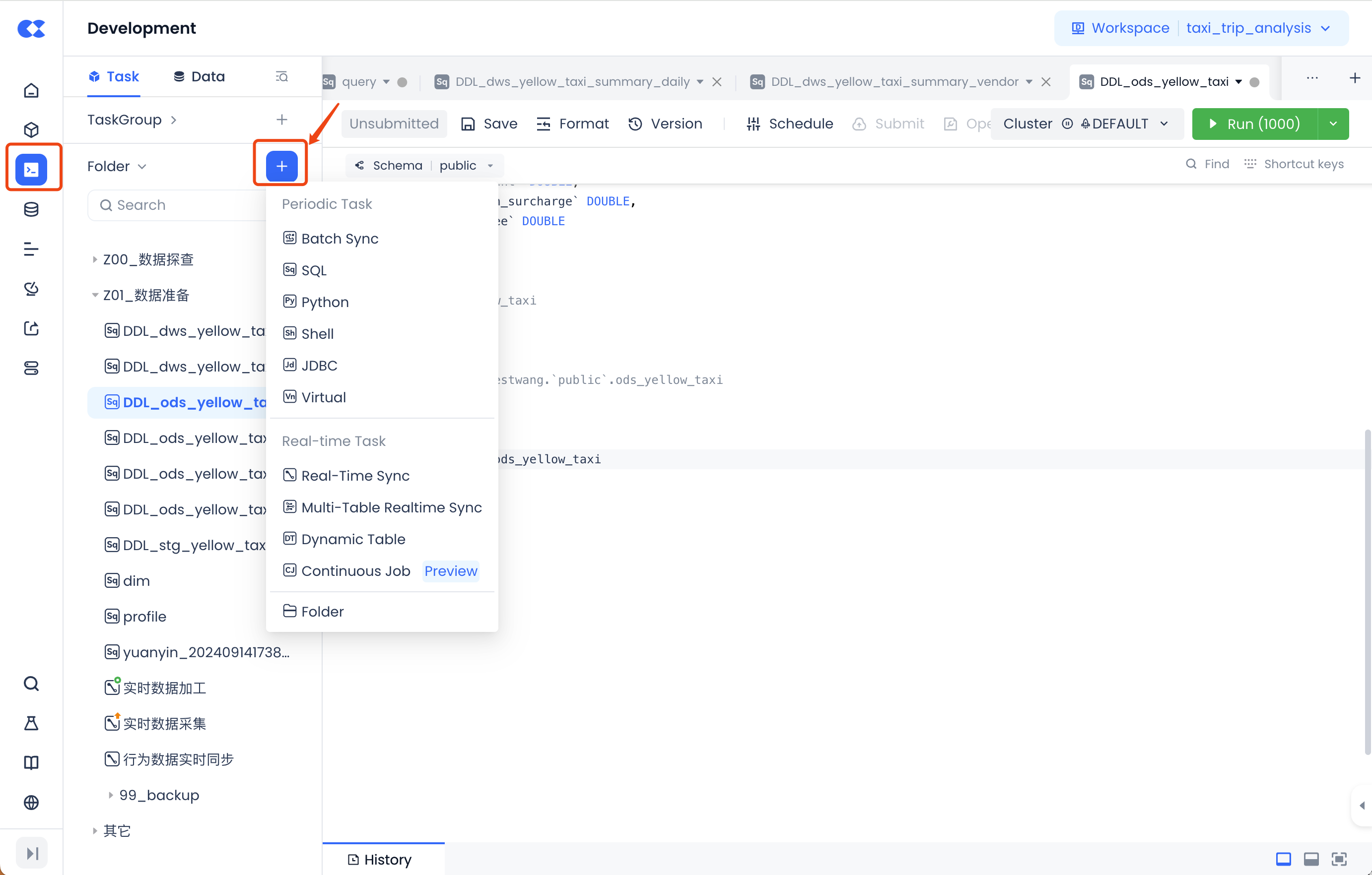 In the task development interface, you can create synchronization tasks, SQL tasks, and other task types as needed through the new button shown in the figure below: