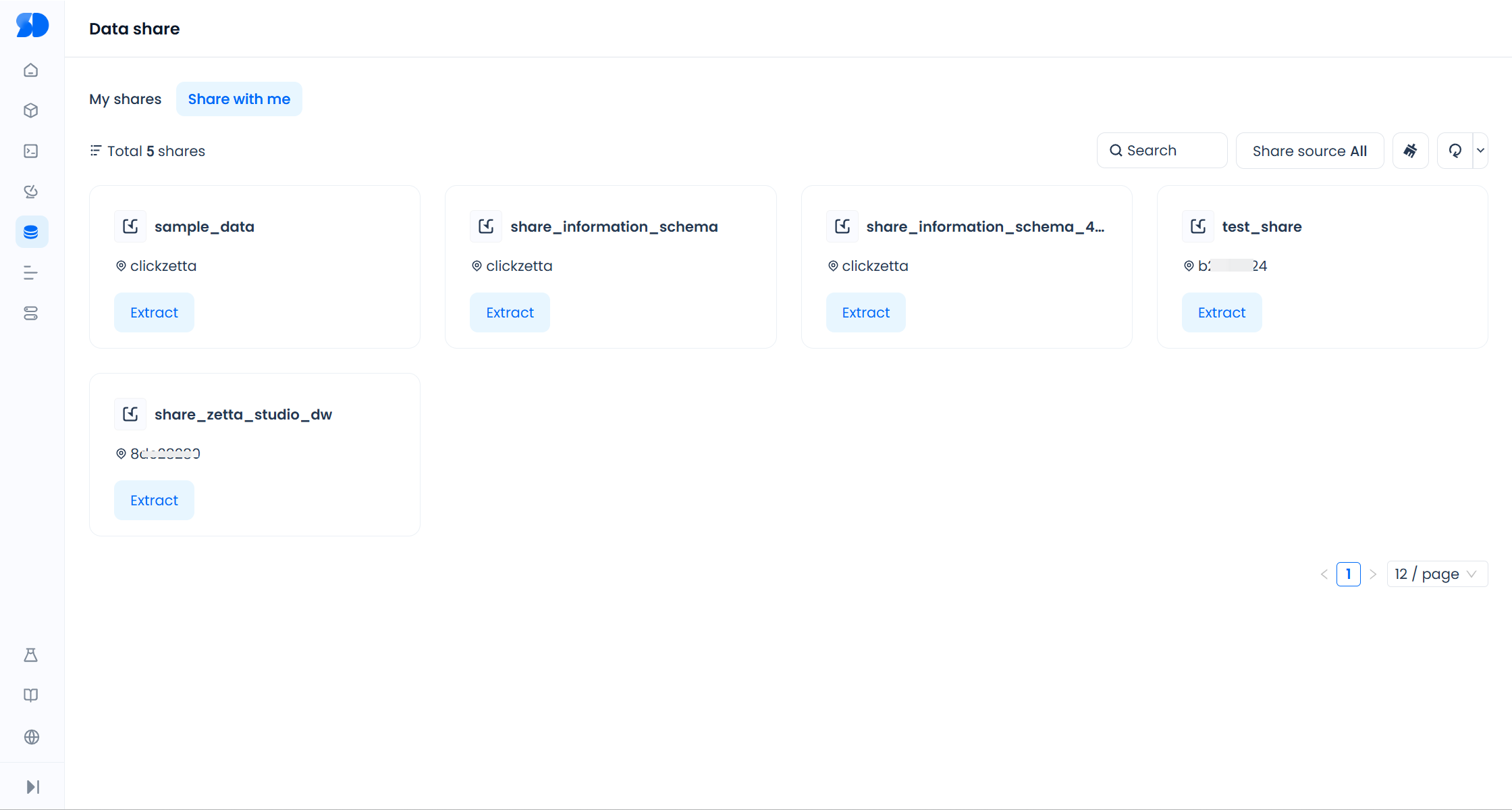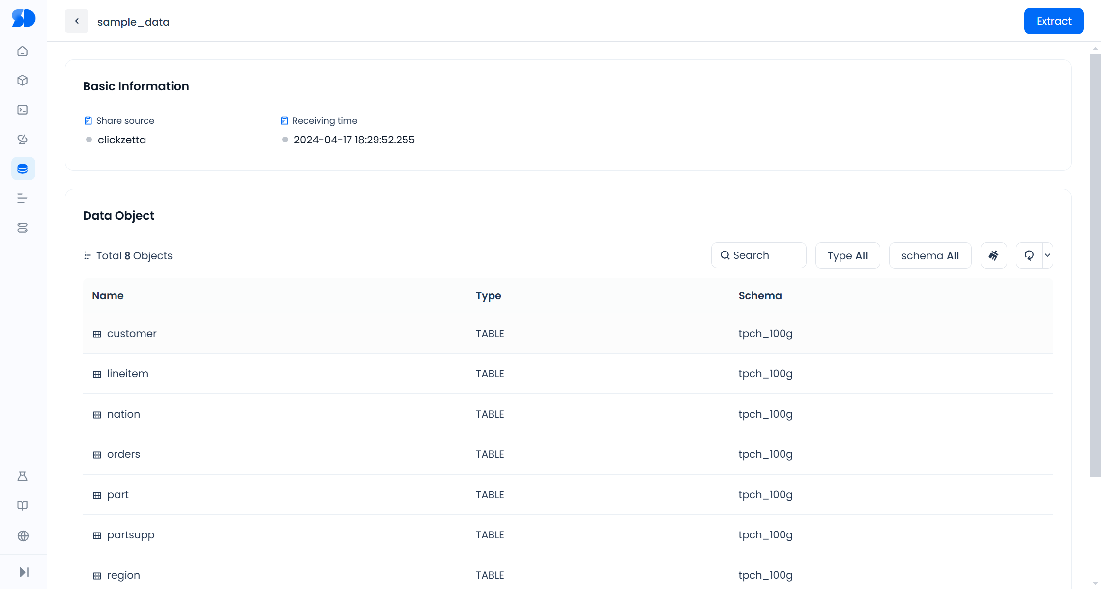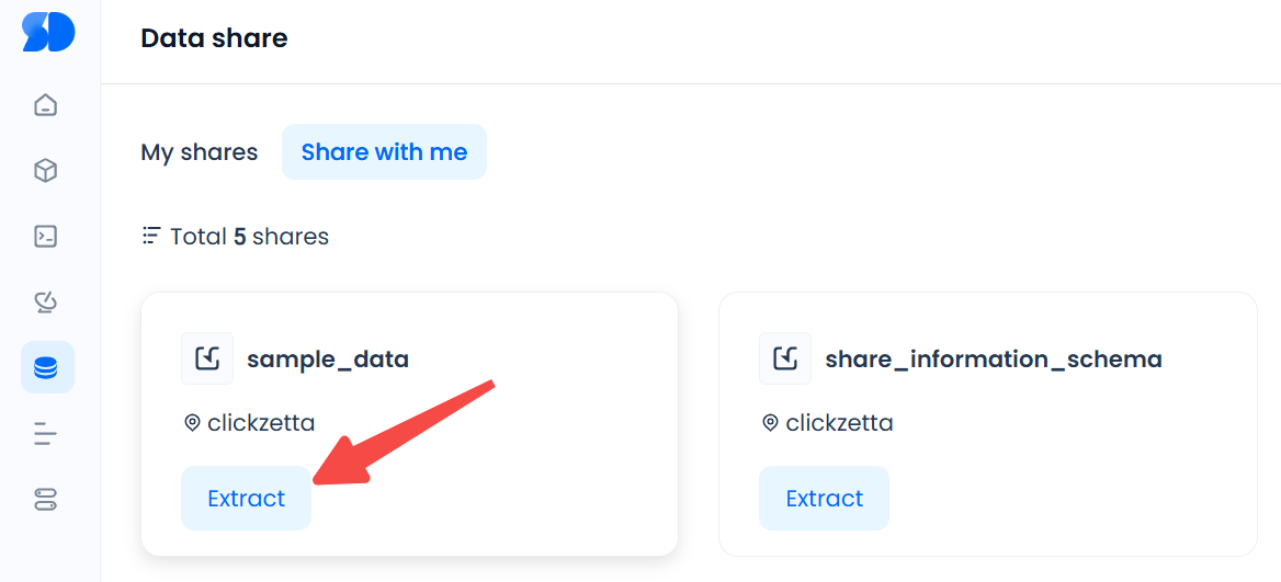 In the "Shared with Me" list page or the details page of the data share object, click the "Extract" button to extract the data from the share.