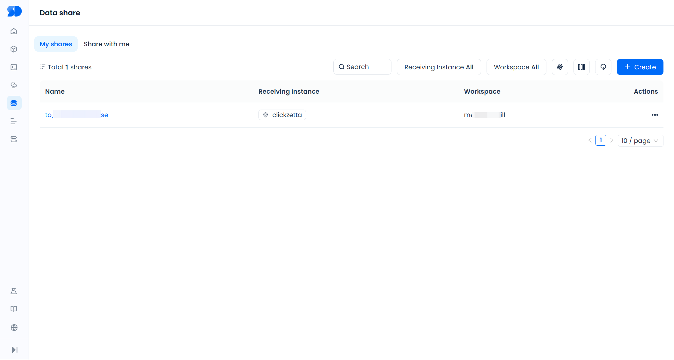 All data share (share) objects created within the current service instance are displayed on the "Data Share" list page. Users with the service instance administrator role (instance_admin) or workspace administrator role (workspace_admin) can view the data share (share) object list.