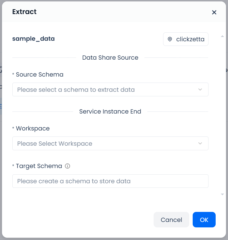 First, you need to select the "source schema," which is the schema data you need to extract from the share. If the data share contains multiple schemas, you need to perform multiple extractions.