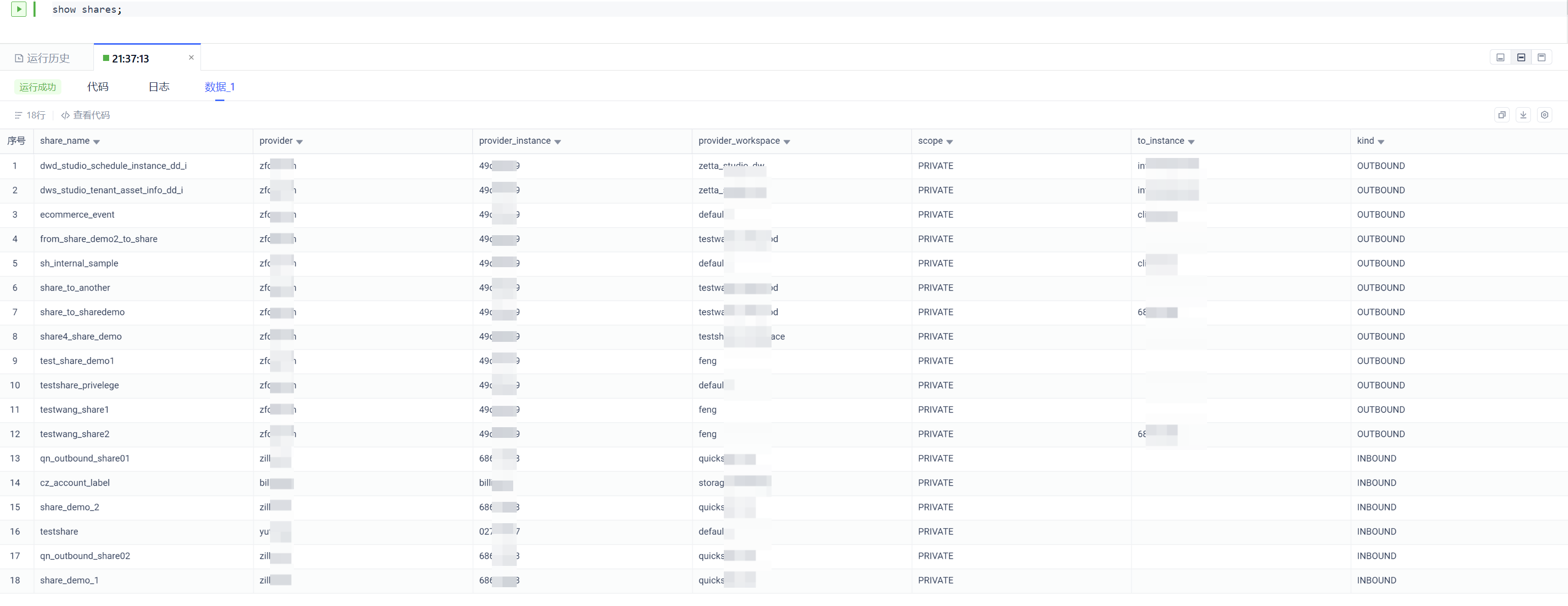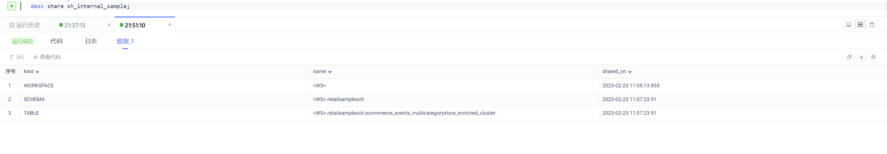 Data consumers can query the shared share objects using the show shares command. The usage and return results are consistent with step 3 of providing data sharing.