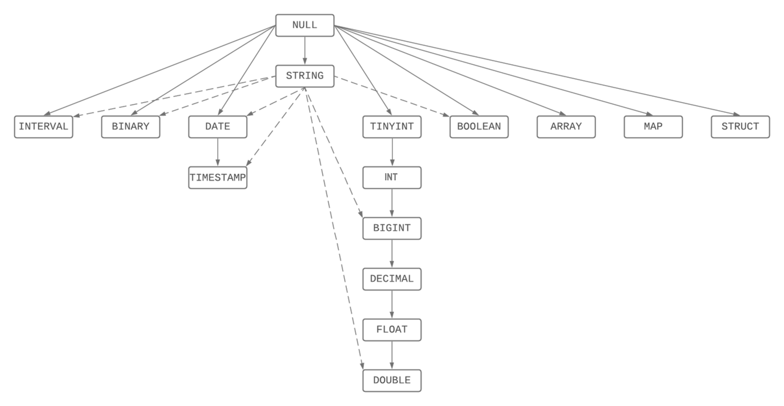 When two values of different types are involved in arithmetic or comparison operations, Singdata SQL will perform implicit conversion according to a certain priority to ensure the precision and range of the operation results. The priority order is shown in the figure below. In other words, if the types of the two values are different, the value of the lower type will be converted to the higher type to match the type of the other value. For example, when an integer and a decimal are added, the integer will be converted to a decimal to avoid precision loss. When a date and a timestamp are compared, the date will be converted to a timestamp to ensure consistency in time granularity.