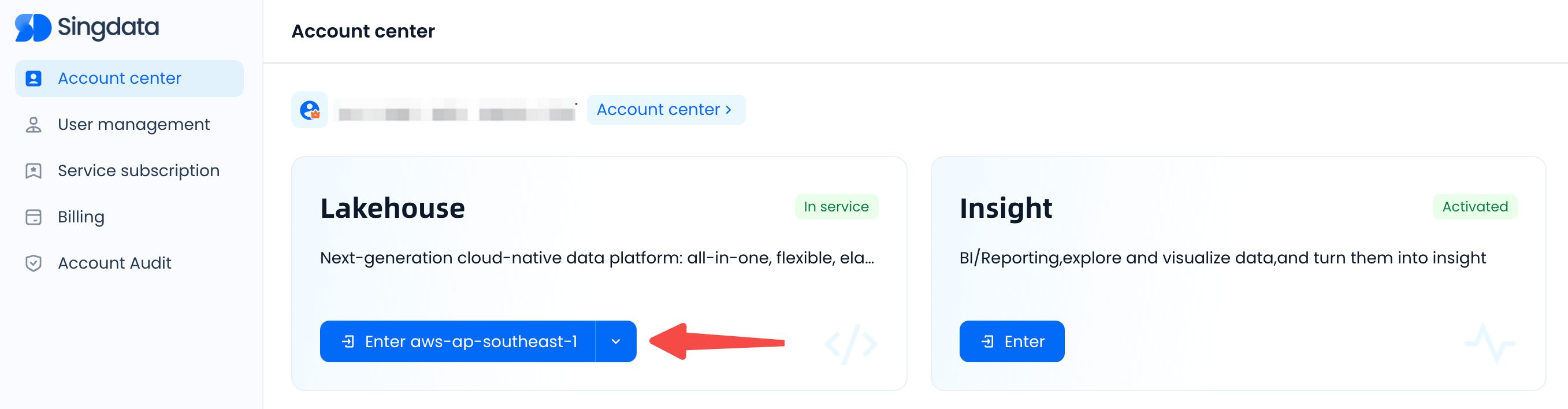 After logging into the Singdata Management Center interface, click the Lakehouse service instance button, and the system will automatically enter the Lakehouse instance homepage.