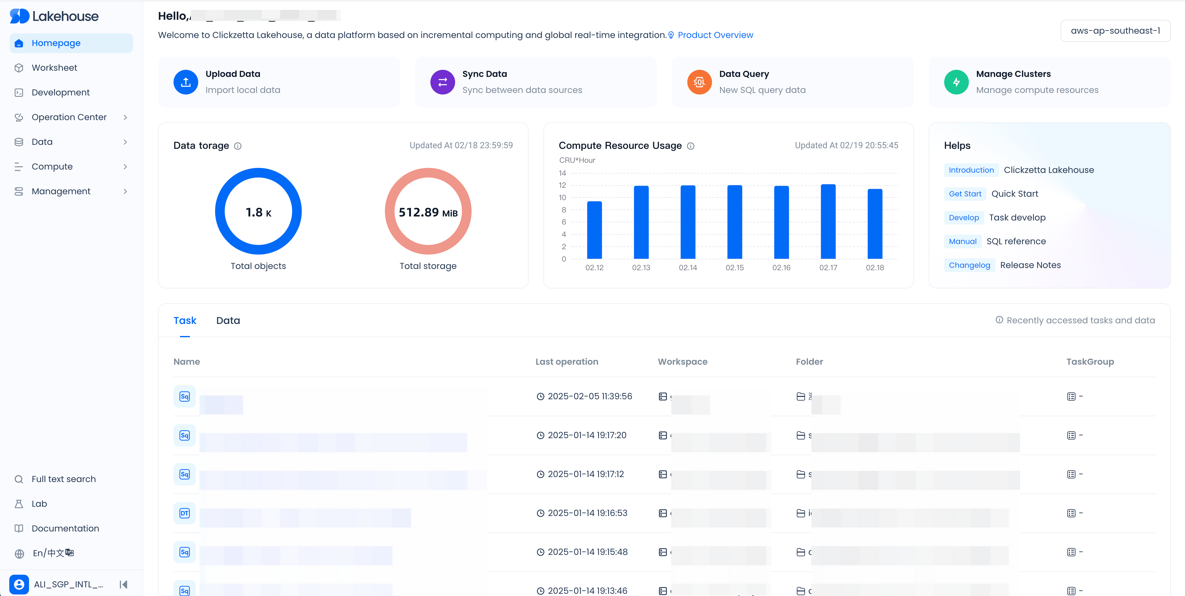 Welcome to the Lakehouse service instance homepage. Here, you can quickly learn about our core product capabilities, view the workspaces you have joined, and easily access various functional scenarios. Below is a detailed usage guide: