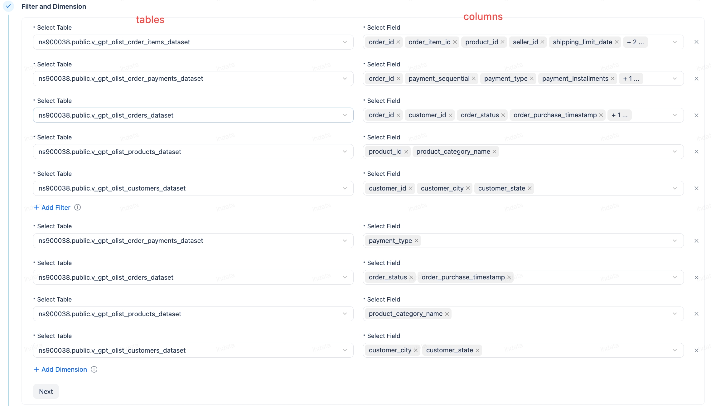 - Filters and Dims Variable Definition: Note: Columns not appearing in Filter and Dims here will not be used as filter conditions and dimensions for the issue. (This is related to the Usage field configuration of the table columns in Data -> Tables: columns configured as FILTER and DIM in the Usage field will be selected by default here, and the final configuration will be based on this page)