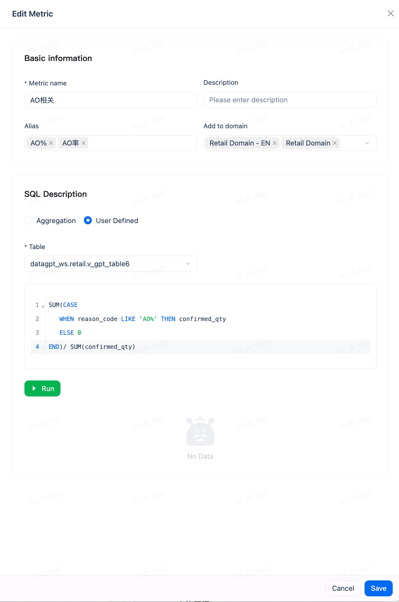 The Answer Builder is used to define metrics with complex calculation logic and to provide SQL templates for detailed queries. In Left Navigation Bar: Data -> Answer Builder, you can click "+ New Answer Builder" and follow the steps to fill in the code.