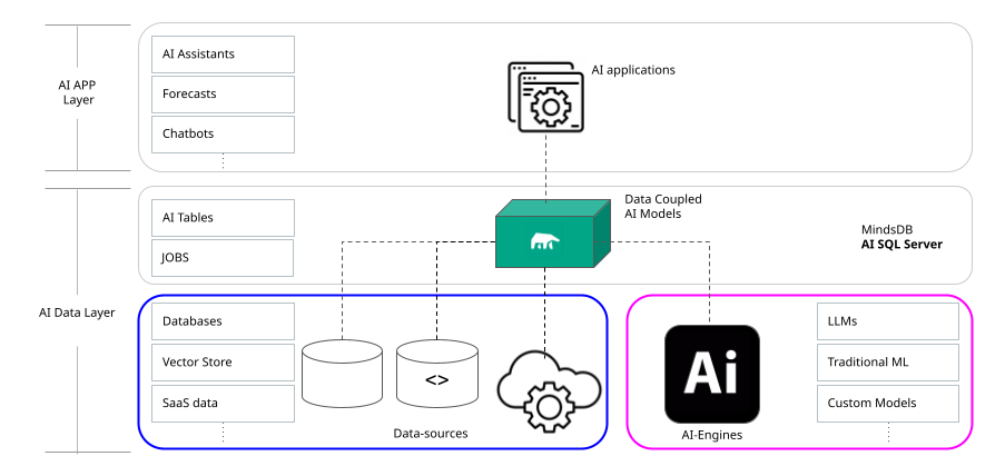 MindsDB enhances SQL with AI building blocks, allowing developers to create AI applications that need to be coupled with real-time data. One of MindsDB's innovations is the ability to treat AI (models, agents, knowledge bases) as virtual tables, enabling you to SELECT FROM, JOIN, and FINE-TUNE from Singdata Lakehouse data sources using any AI engine.