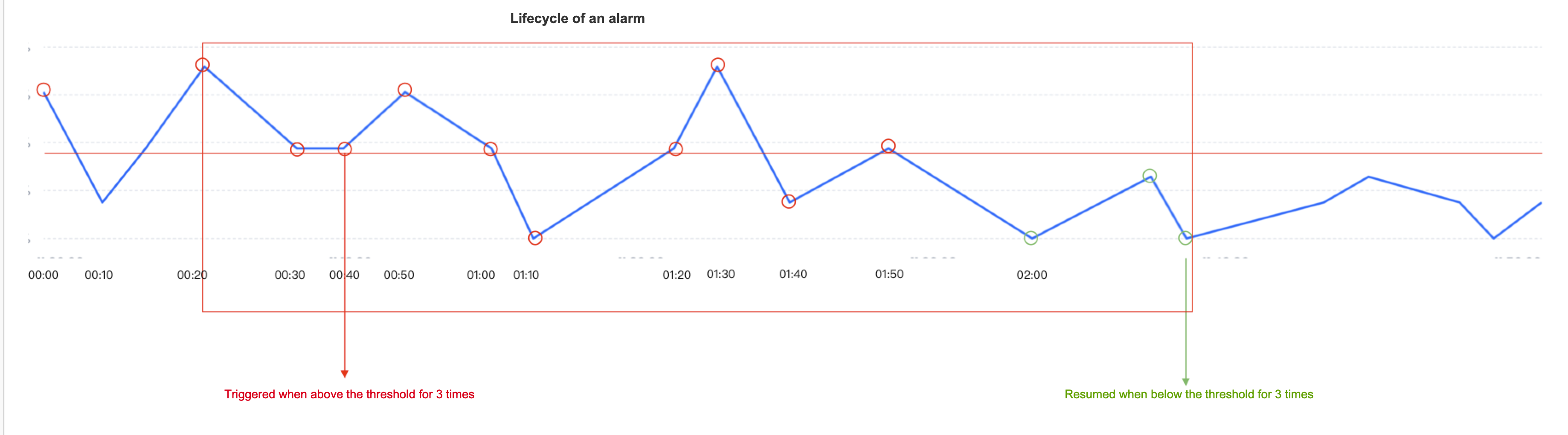Starting from 02:00, the next three indicators are all below the threshold, so the first alert is restored and no more alert notifications are triggered.