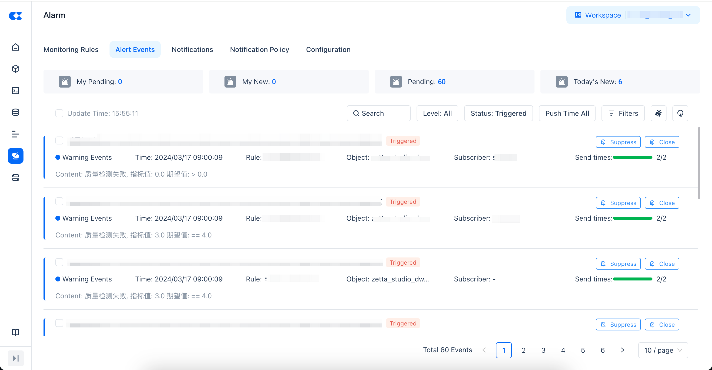 The monitoring function allows you to monitor abnormal situations such as task running status through built-in rules or custom configuration rules, and send alert information.