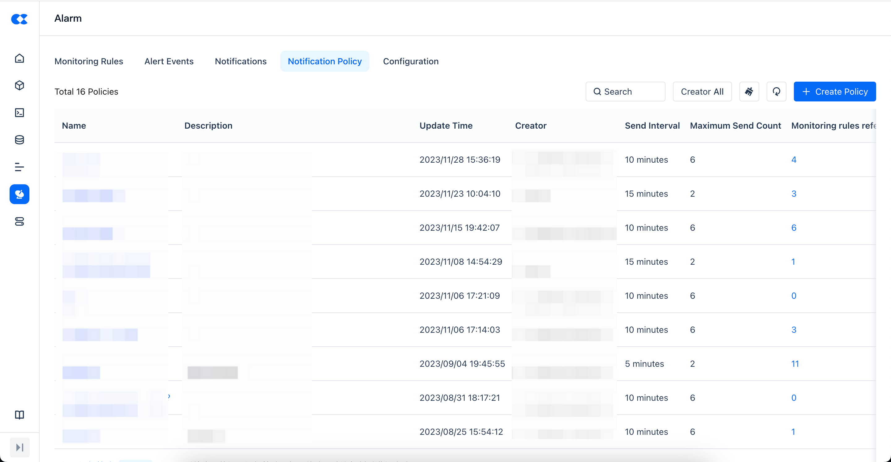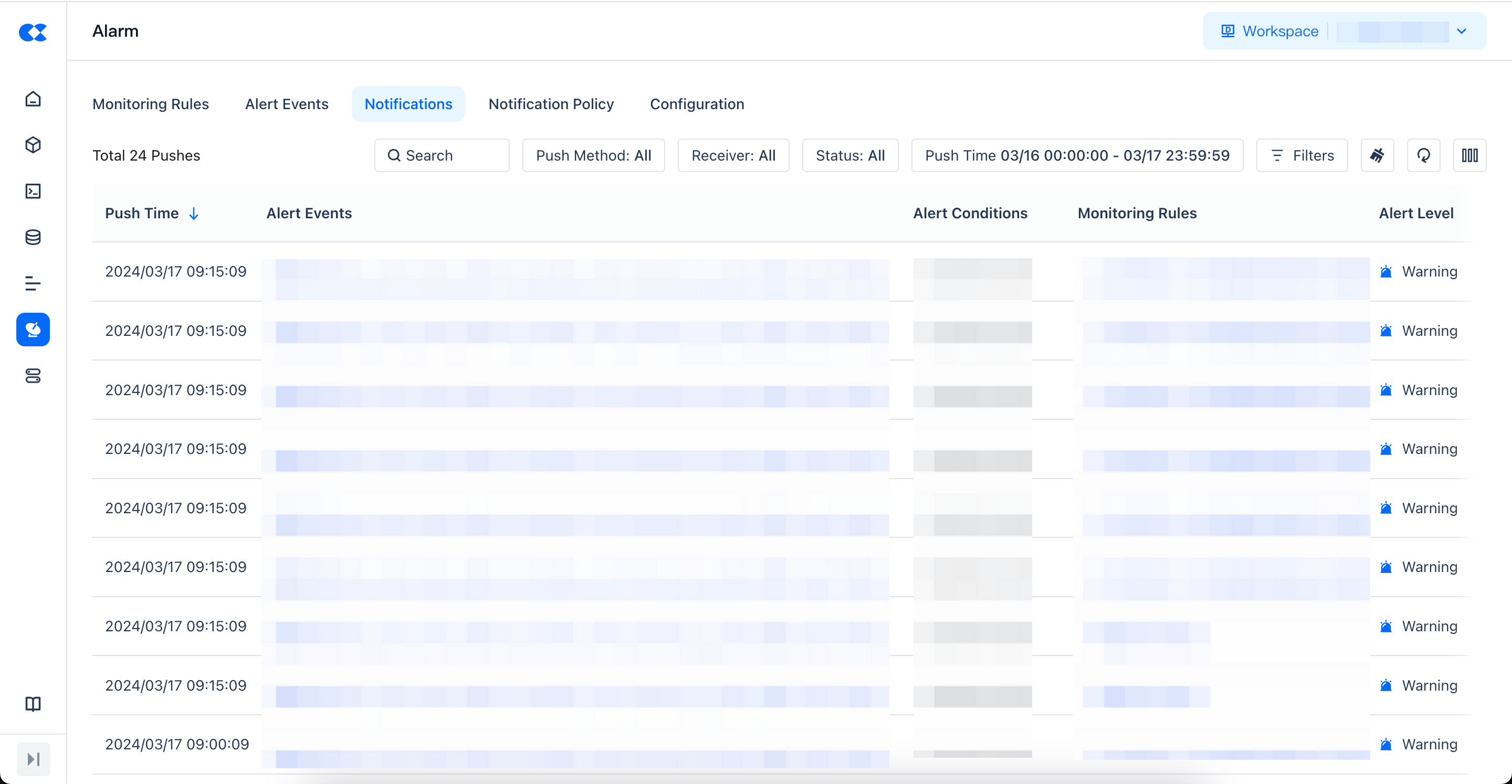 Notification History | The information record actually pushed to the user after the alert event is generated. The push of alert notifications will be affected by the following three strategies |