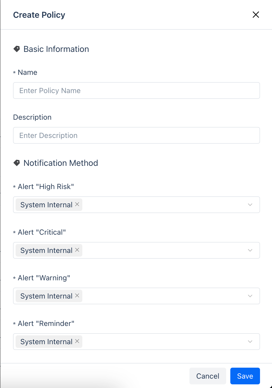 Notification Method | High Risk Alert | Set the specific method of notification for different alert levels, the supported methods are: wehook SMS Phone |